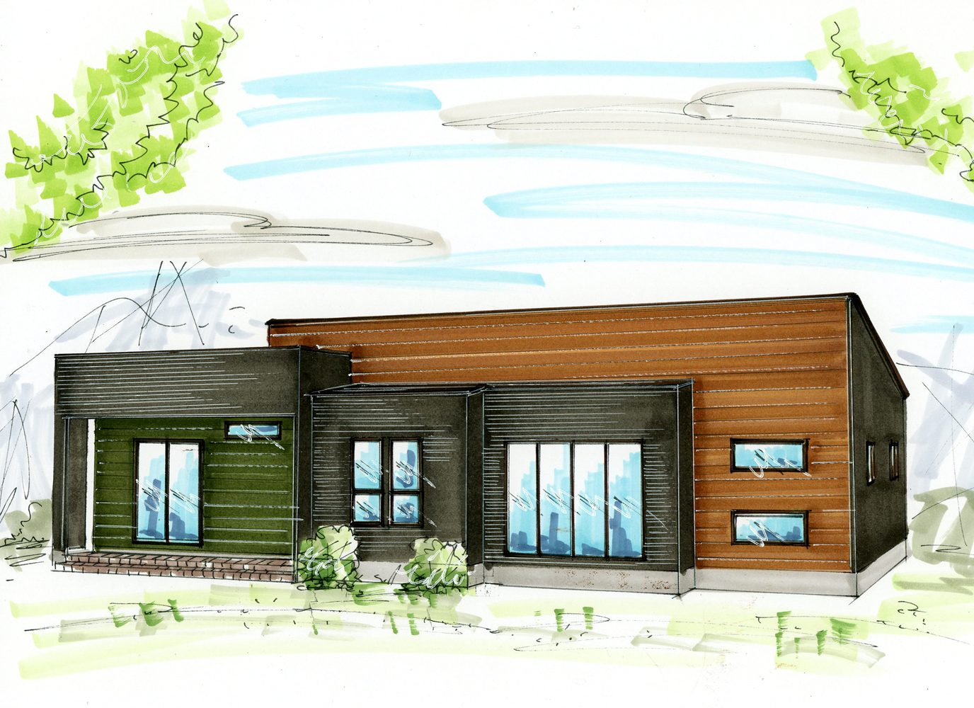 木目調×黒のシックな色合いにダークグリーンにアクセントをプラス。 大人かっこいいお家のご提案です。