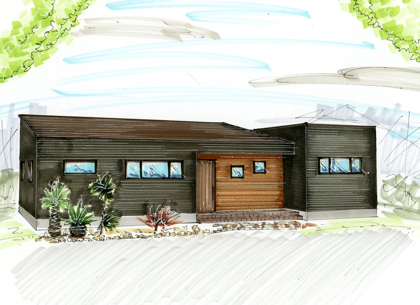 南からのパース 箱を積み重ねた様な外観です。