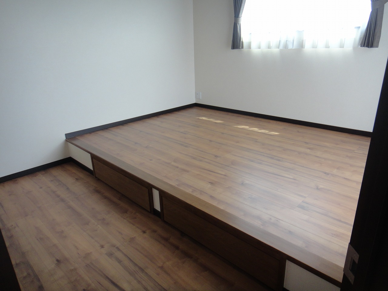 通常は床を1段上げて作りますが、そのスペースを利用した収納付きベッドです!