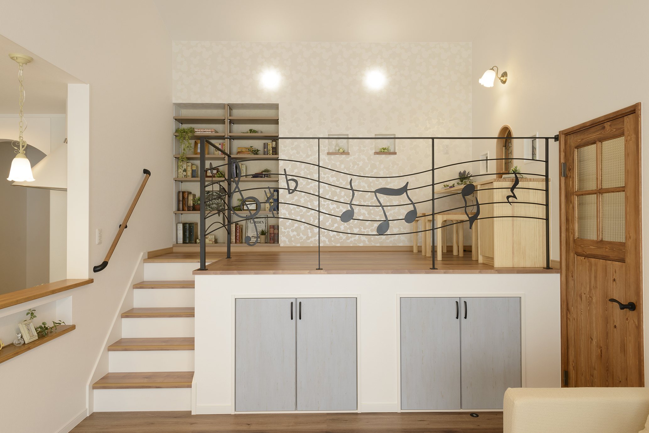 縦格子アイアン風の手すり。スキップフロアーの下は大型収納。