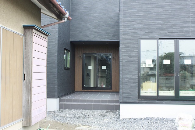 プライベートを守れるタイルデッキもあります。ワンポイントの木目調の外壁も 良いですね~。