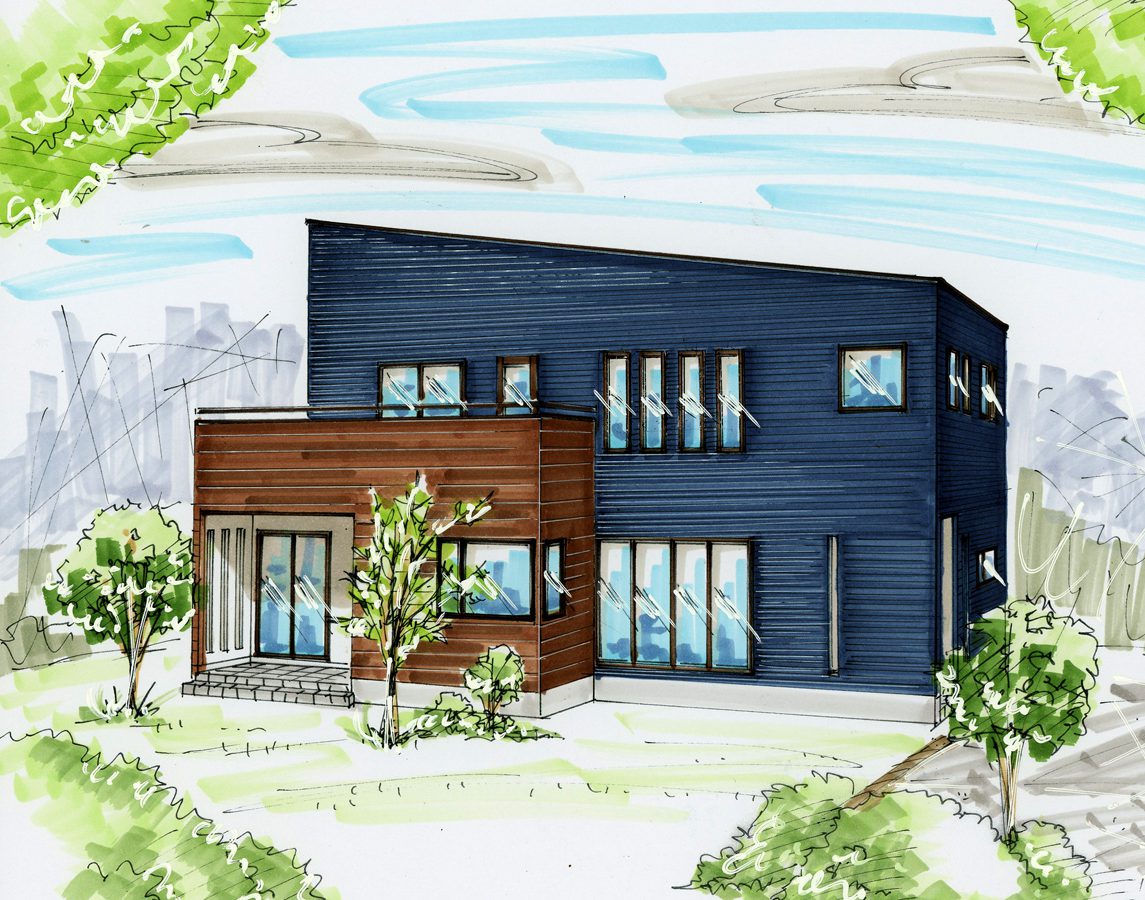 シンプルな片流れ屋根に四角い箱が付いたような外観です。ネイビー×濃い木目調の組み合わせは、大人かっこいい雰囲気になり素敵です😄