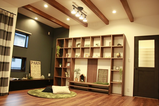 オープンな空間ですが、壁のクロスをダークな色合いにすることで