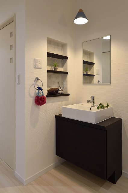 ⇑既製品の洗面台とニッチ棚板の塗装を合わせてまとまりのあるシンプルな洗面空間に!このお家もニッチの奥面にはアクセントに柄クロスを貼っています!