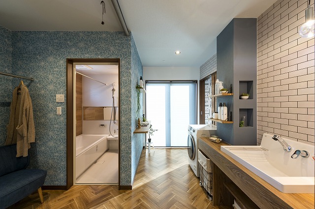 ⇑伊勢崎平屋モデルハウス 洗面・ランドリールーム:ブルーのアクセントクロスが印象的なフカシ壁にニッチと棚の両方を。洗面用品の『見せる収納』やお気に入りの小物を飾ったり・・・使い方はイロイロ!