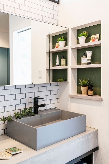 ⇑モルタルを使ったシンプルでカッコいい造作洗面台。3段のニッチには日用品や雑貨を!お客さんに見せたくないものはミラーキャビネットに収納できます!ニッチ奥面のカーキのクロスがとても映えています✨