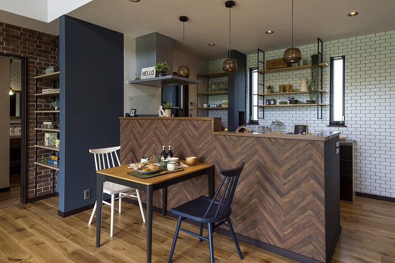 ⇑ハシゴ状の金物に棚を段違いで取付。棚カラーも他でつかっている木の色味と合わせて統一感も◎右側トール収納にはたくさん食器をしまうことができます!