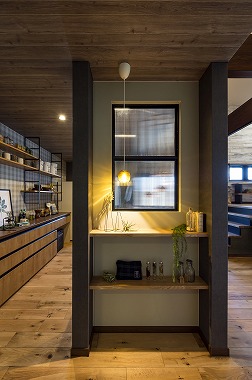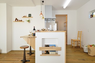 キッチン腰壁の横側にお気に入りの雑誌や料理本を立てかけて収納しておける、ウッドバー付きのマガジンニッチもオリジナルでつくることもできます。キッチンカウンターはご家族ごとの生活に合わせて高さも自由に決めることができるので、上の施工例写真のように少し高めなバーカウンターにすることで、キッチンで料理をしながらカウンターにいる家族との会話も弾みそうですね♪