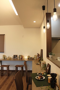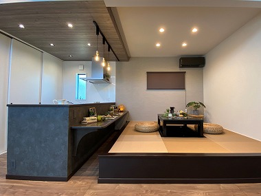 上の施工例写真のようにリビングより少し高くタタミスペースをつくることで、脚を下してタタミに直接腰かけながら、カウンターで食事を楽しむこともできます。こちらのお宅は以前に完成見学会をさせていただいたのですが、ご来場いただいた方々から大好評でした◎
