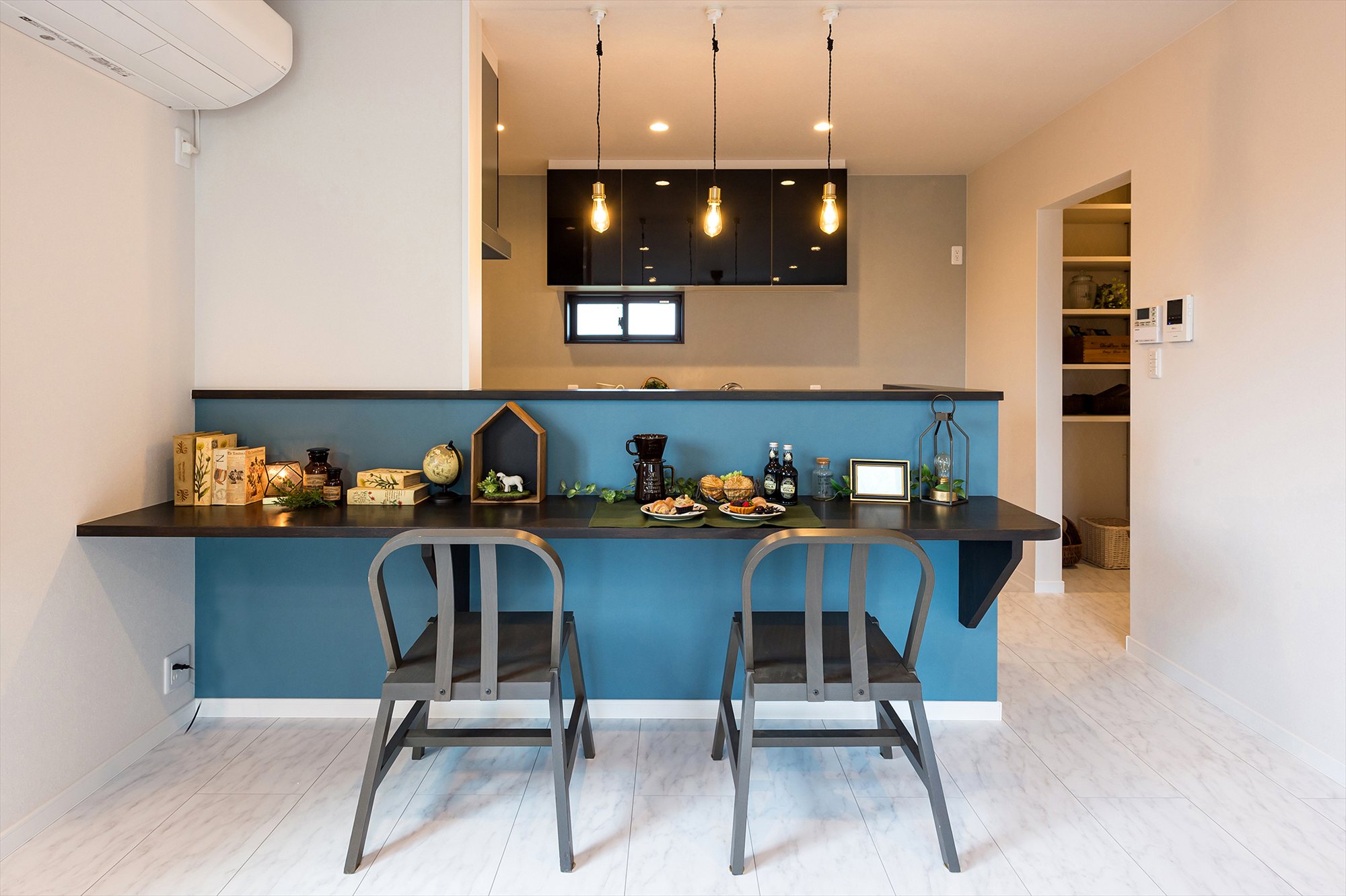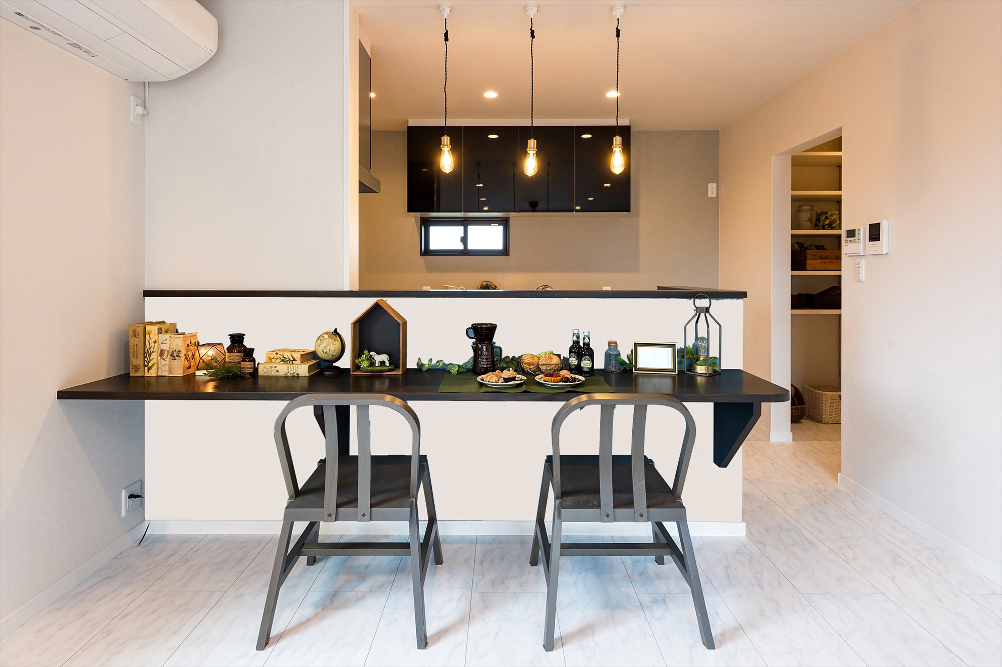 白が基調のLDK。濃いめのカウンターが締まった印象です。