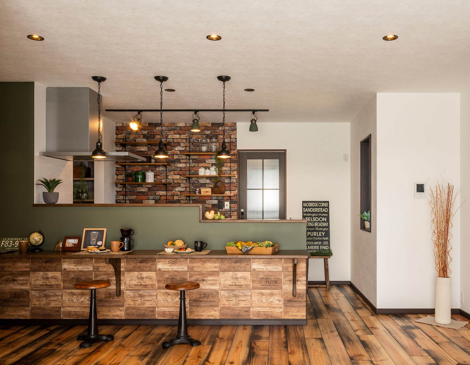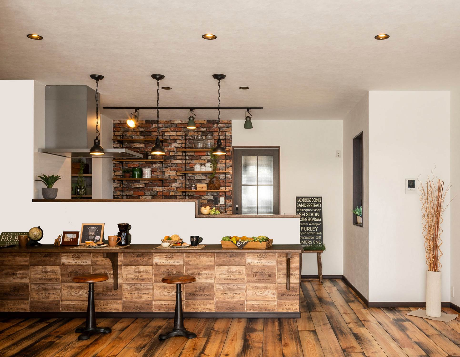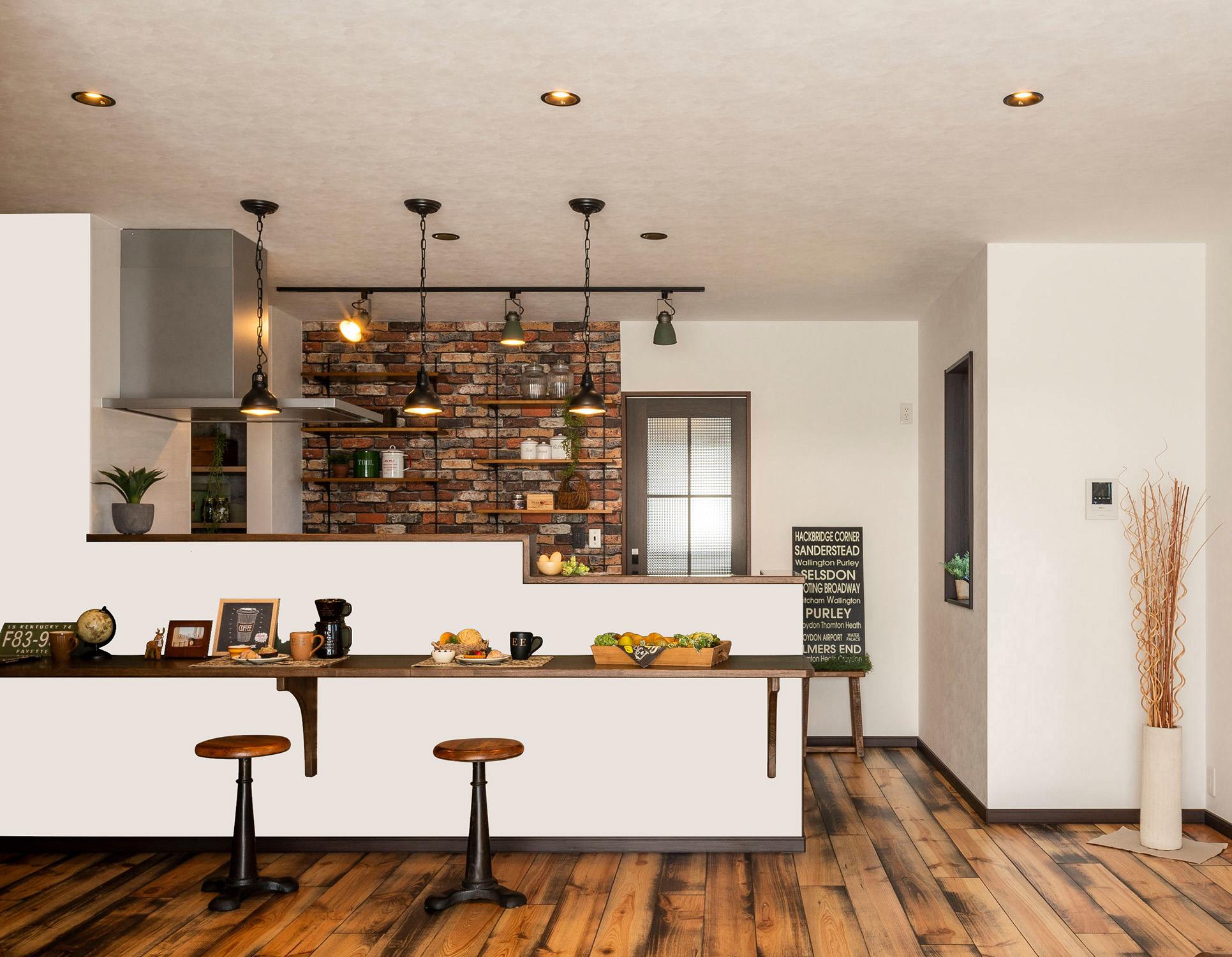 キッチン奥の見せる収納部分は武骨な印象のレンガのタイル調のクロスです。