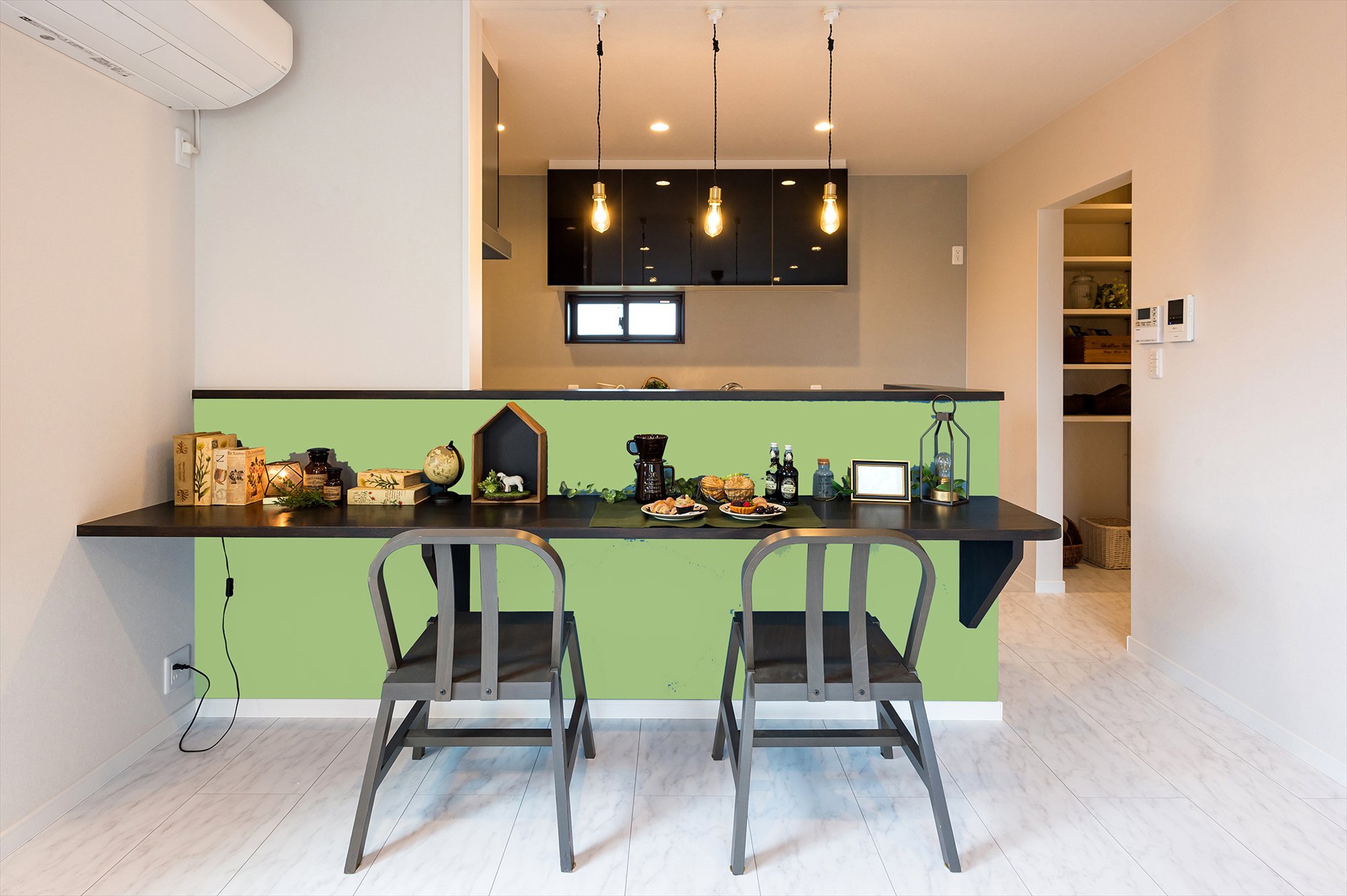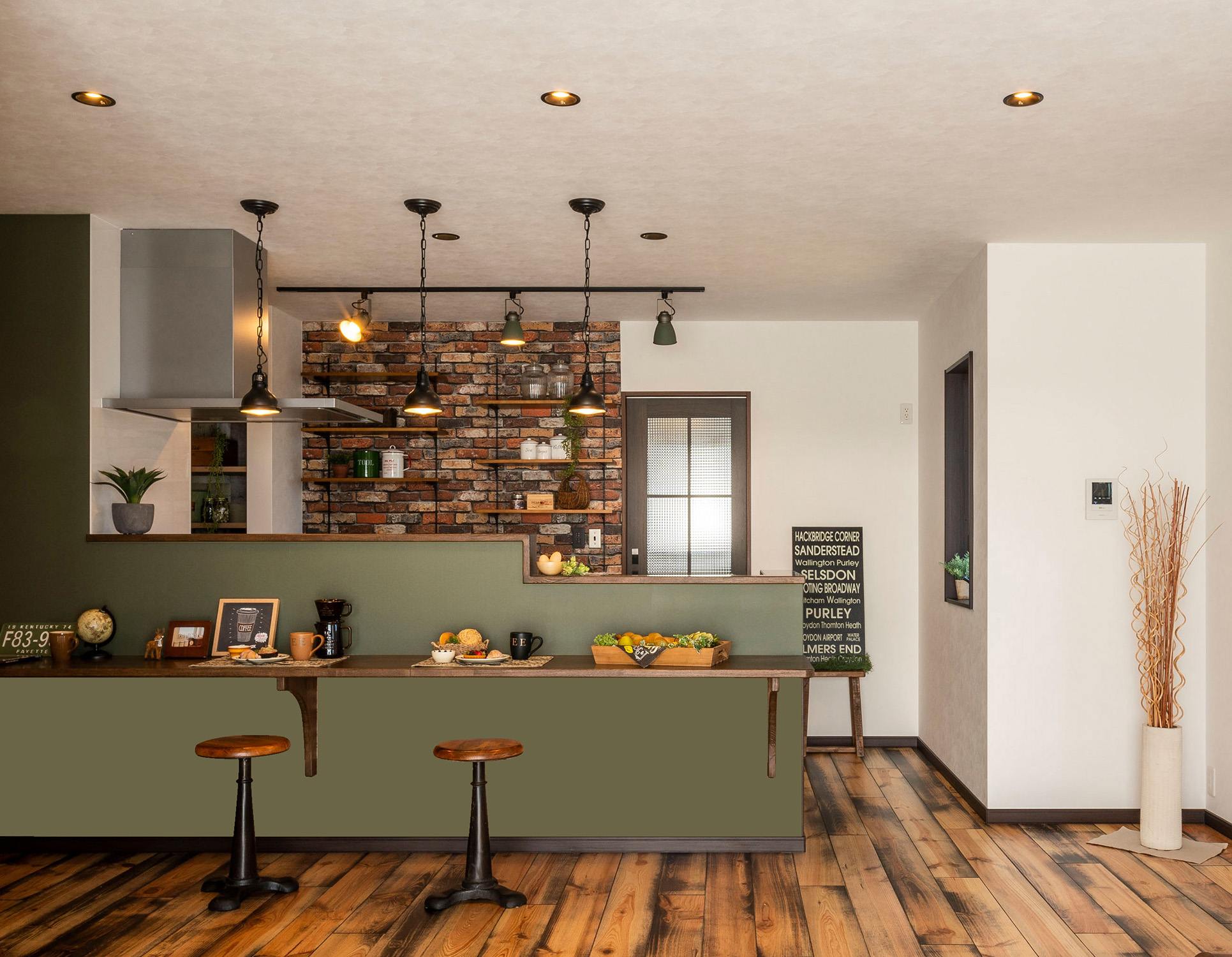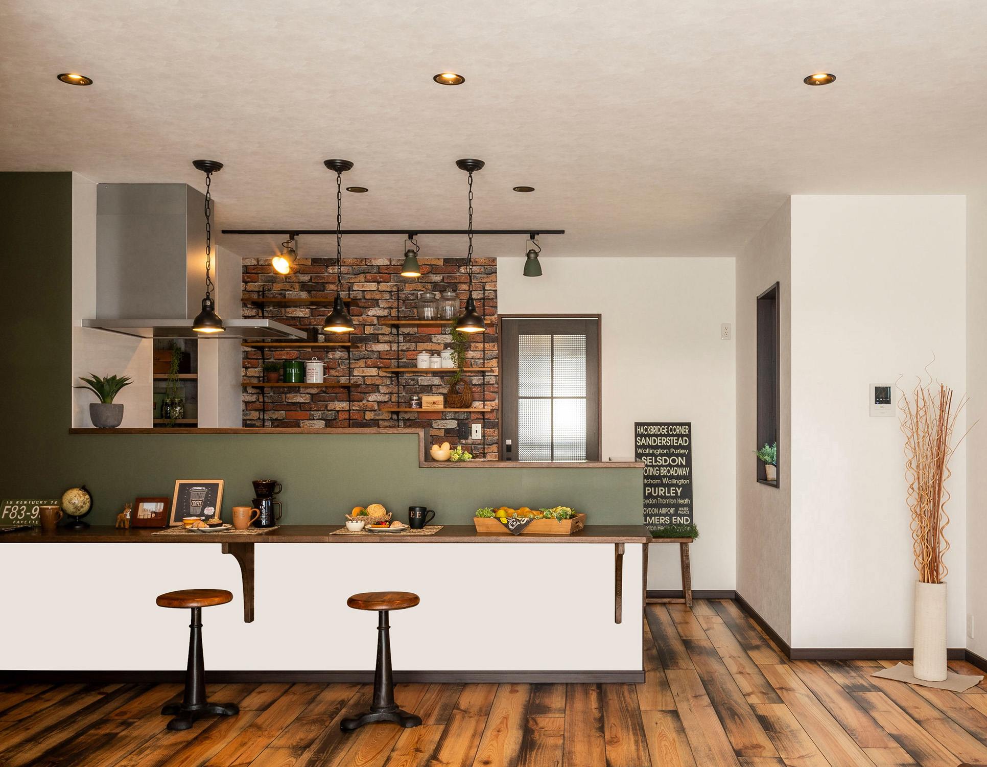 キッチン奥の見せる収納部分は武骨な印象のレンガのタイル調のクロスです。