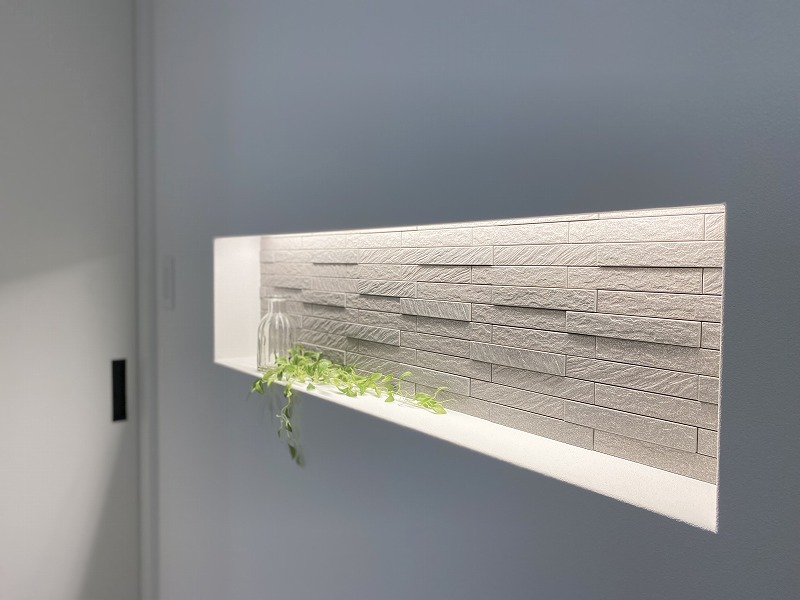 ⇑ニッチの奥面に施工。間接照明の光で素材の凹凸がより際立ちます✨飾りを置かなくてもお洒落なインテリアになりますね♪