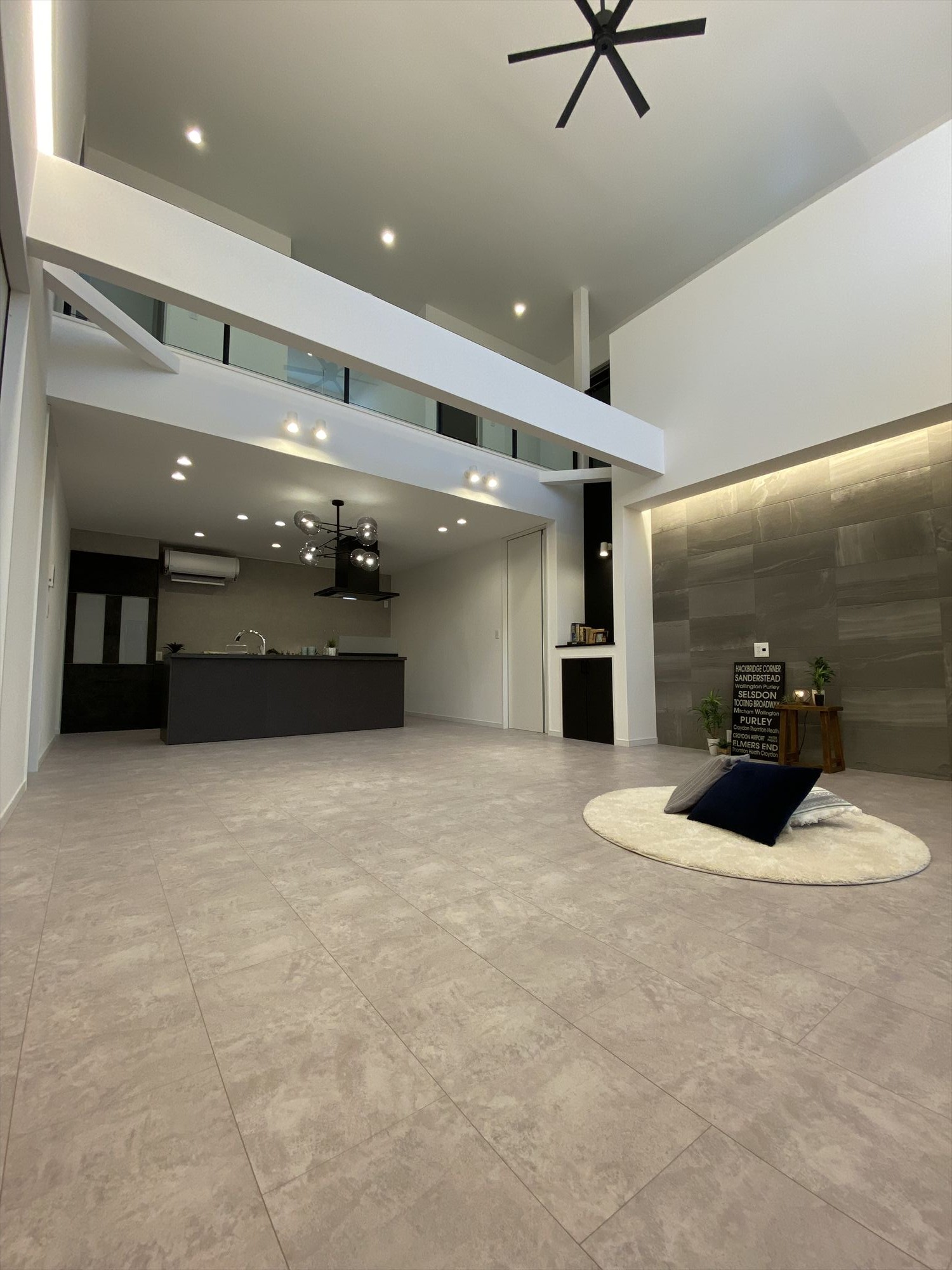 こちらのお家は、白を基調とした空間に石目調のグレーの床とエコカラットで統一感を。間接照明の効果もあり、高級感溢れる空間に仕上げています。