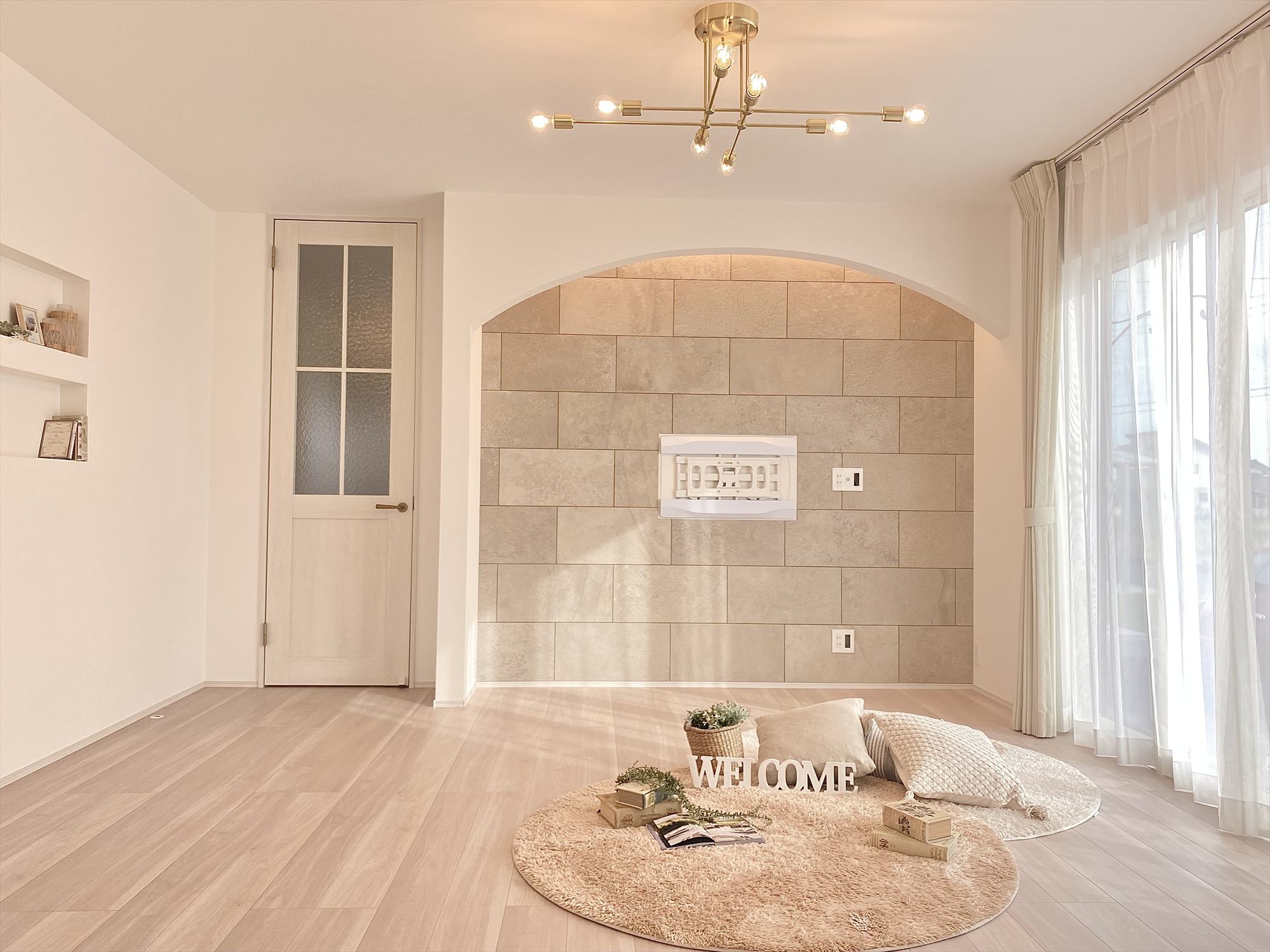 こちらはリビングの壁掛けTV面です。アーチ奥の間接照明と石目が大人可愛い空間を引き立たせています✨
