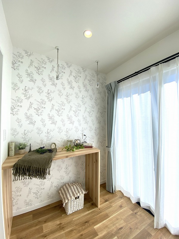 ⇑こちらのランドリールームはアイロン掛けや洗濯物をたたむことができるカウンターを造作!メラミン材でつくった木目柄のカウンターとお花柄のアクセントクロスでナチュラルで大人可愛い空間に🌼