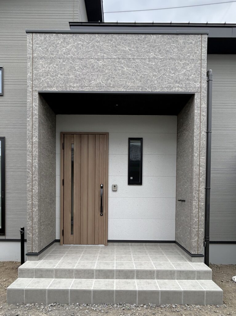玄関周りのマーブル調のサイディング、他にあまりない柄と色味で私もお気に入りになりました!