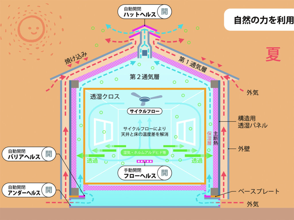 機械設備だけに頼るのではなく、季節によって変化する自然の力を上手に利用しながら、室内の湿気やにおいを外へ逃がし、快適な空気環境を保つことを目指しています。