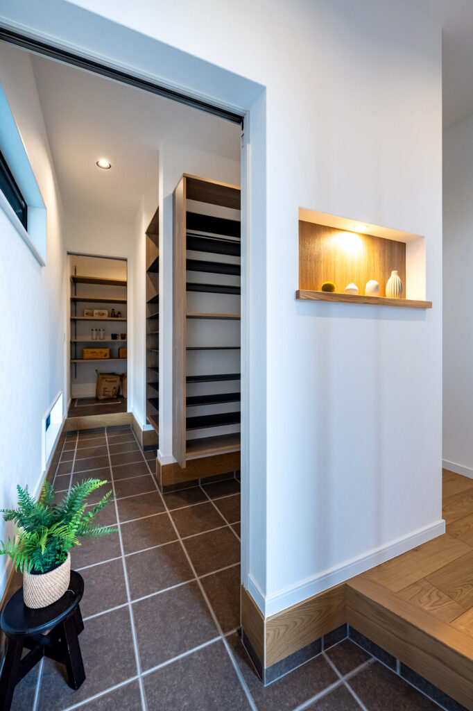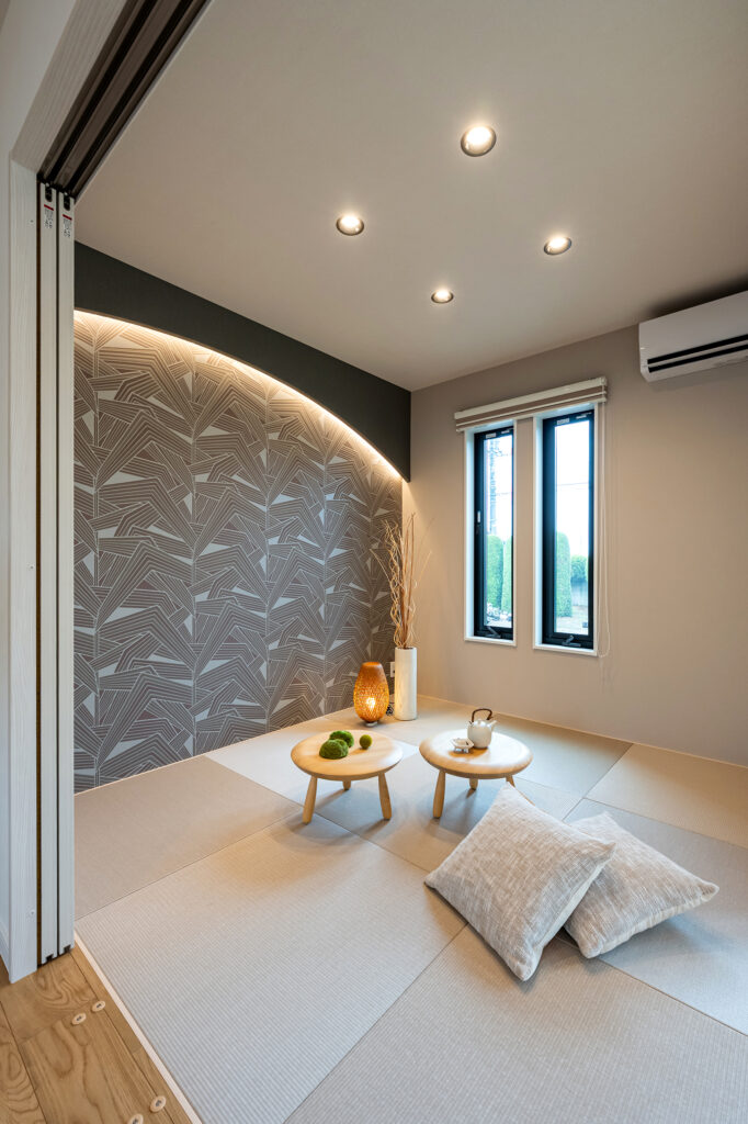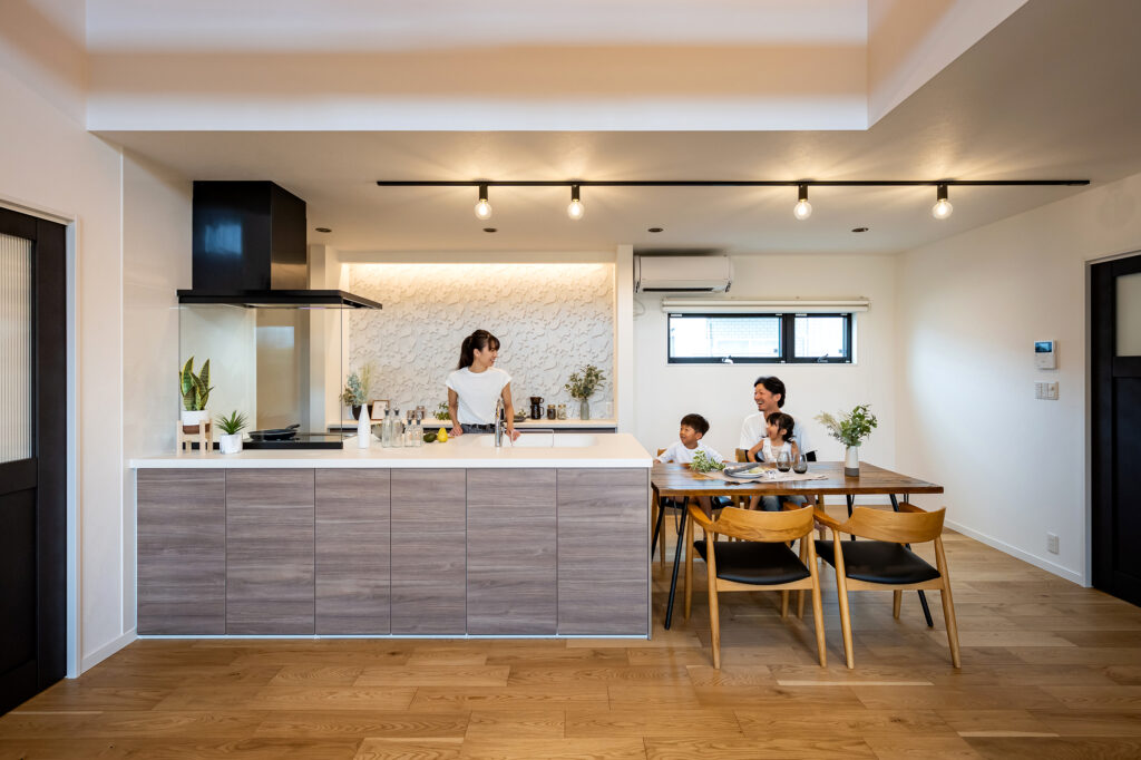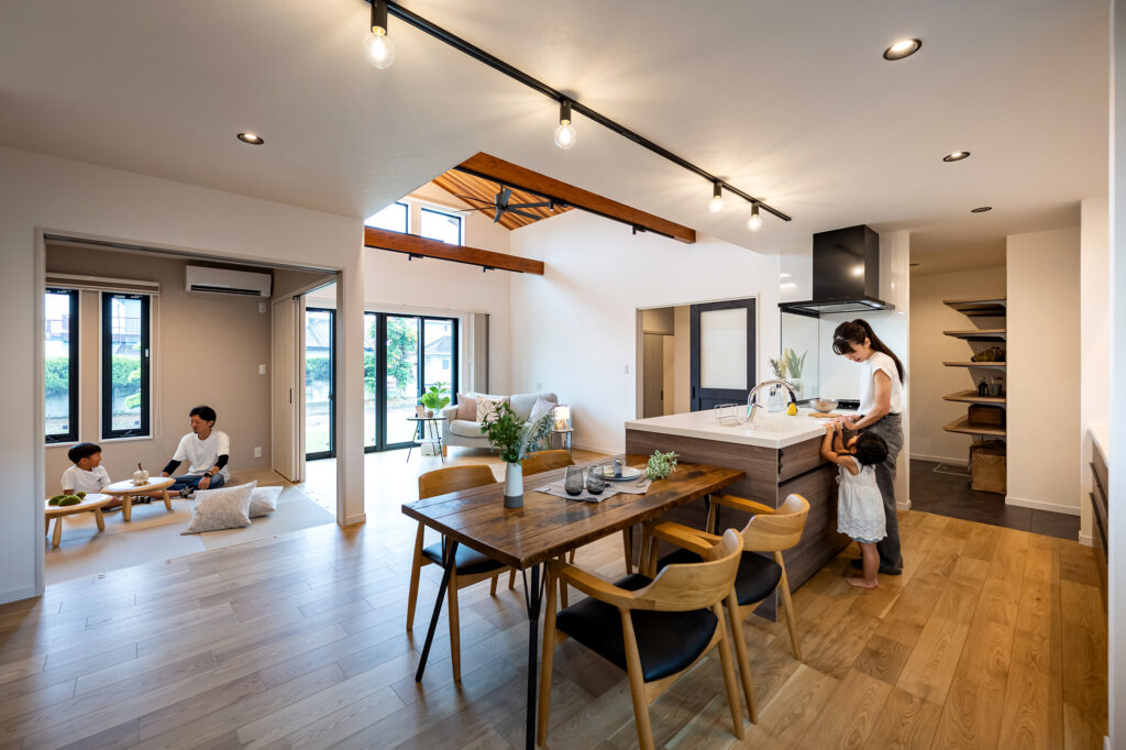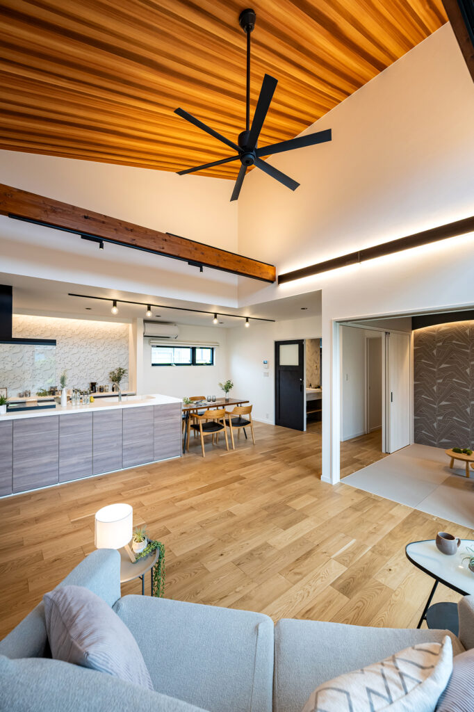 玄関からは土間続きで一直線にパントリーへ入れる「最短の買い物動線」を確保。荷物を持ったままキッチン横へすぐアクセスできるので、日々の暮らしがぐんとラクになります。LDKは、一番高いところで天井高4.6mの勾配天井を採用し、平屋でありながら圧倒的な開放感と光あふれる空間に。リビング続きに4.5帖の和室を併設。アーチの間接照明も注目ポイントです。