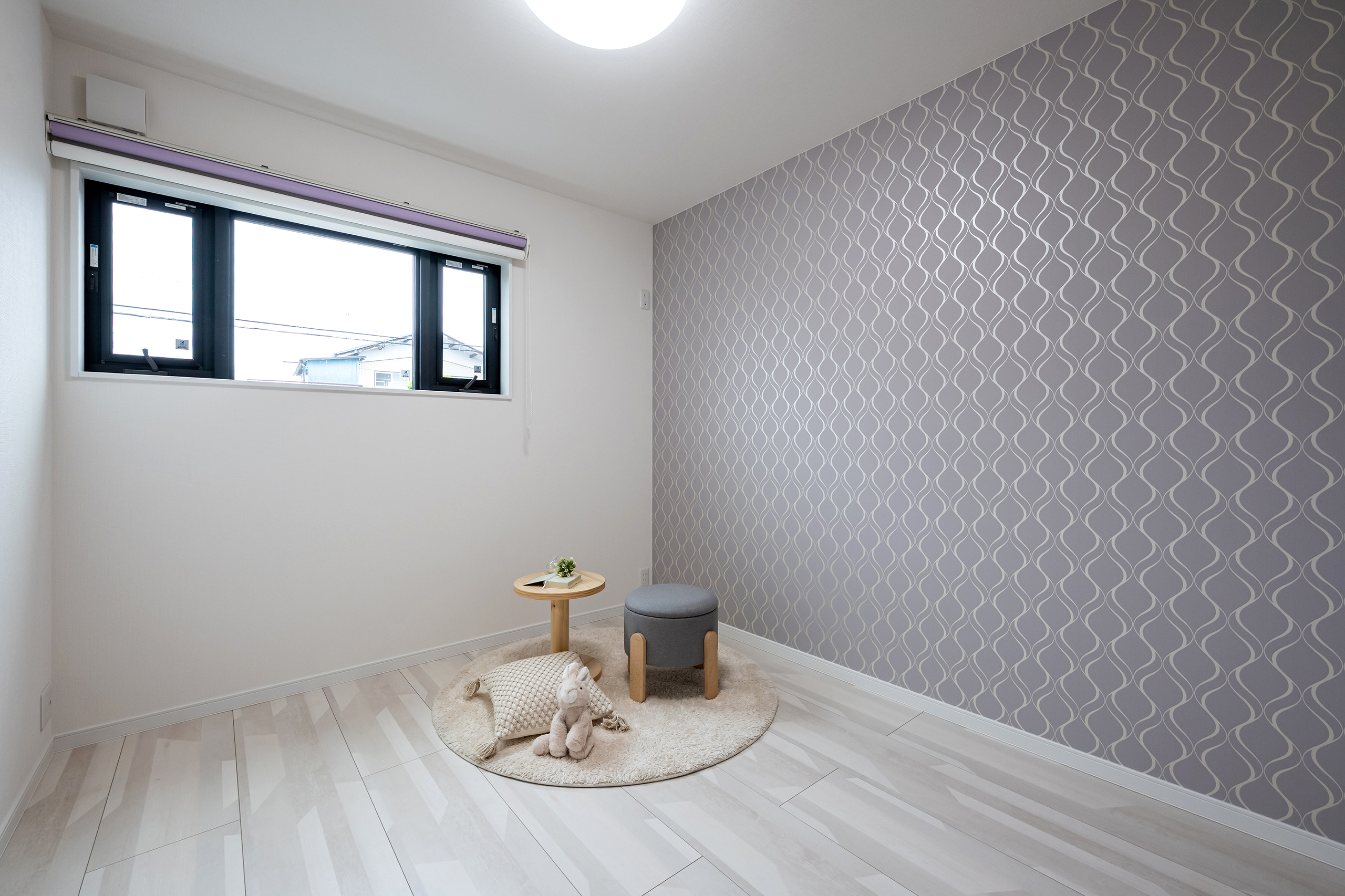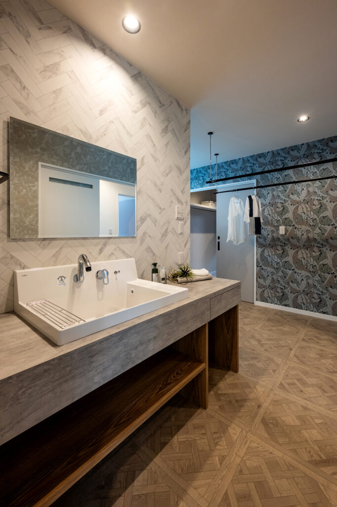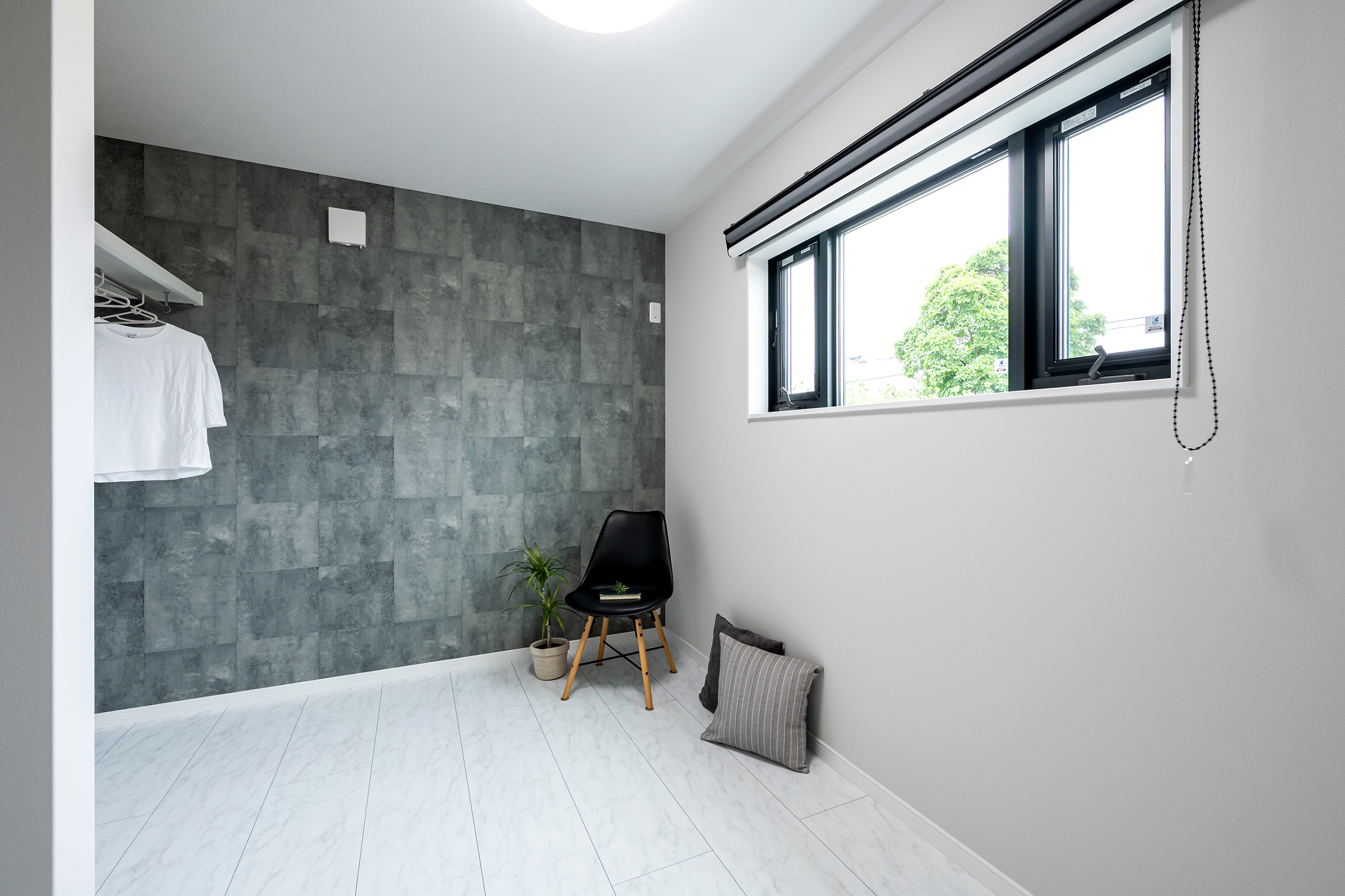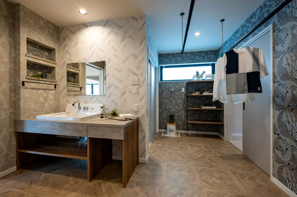 室内は、グレーやベージュを基調にしたアクセントクロスで落ち着いた印象に仕上げ、各所に柄の異なるクロスを配して遊び心もプラスしました。家事動線にも工夫が満載。洗う → 干す → しまう が一直線で完結する、スムーズな洗濯動線を実現。時間もストレスもかからず、毎日の家事がもっとラクになります。ウォークインクローゼットには、南海プライウッドの「ウォールゼット ノエル3 深型フレーム引出し」を採用。使いやすさと収納力、見た目の美しさを兼ね備えたこだわりの空間です。