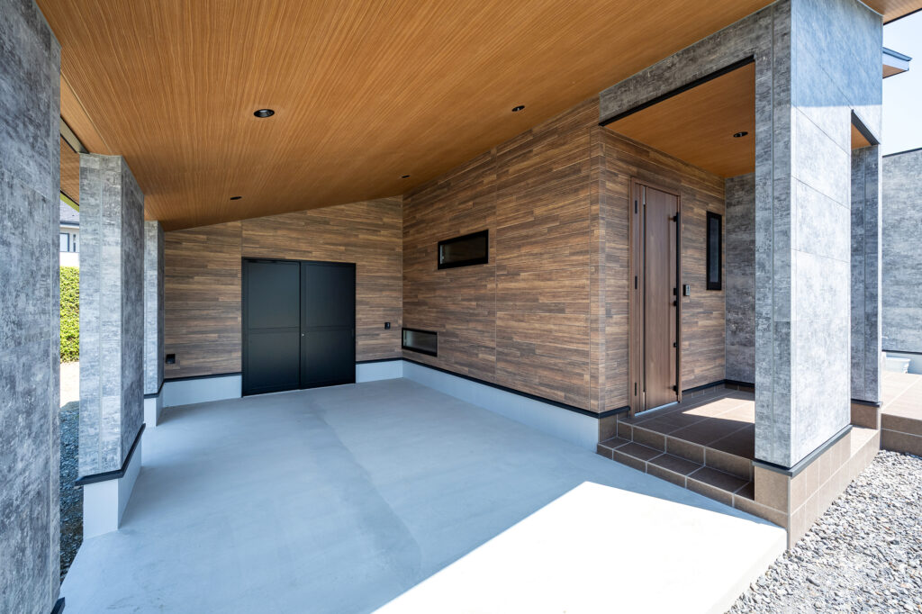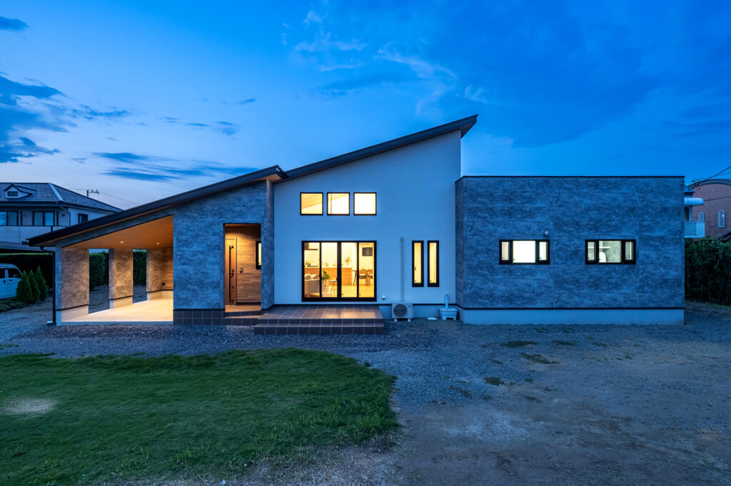 オープンタイプのインナーガレージ付き平屋の住まいをご紹介します。屋根付きのガレージスペースは、車を降りてそのまま玄関へ。雨の日でも濡れることなく家の中へアクセスでき、買い物帰りや子育て世代にもうれしい設計です。タイヤやアウトドア用品がしまえる外収納も併設しています。