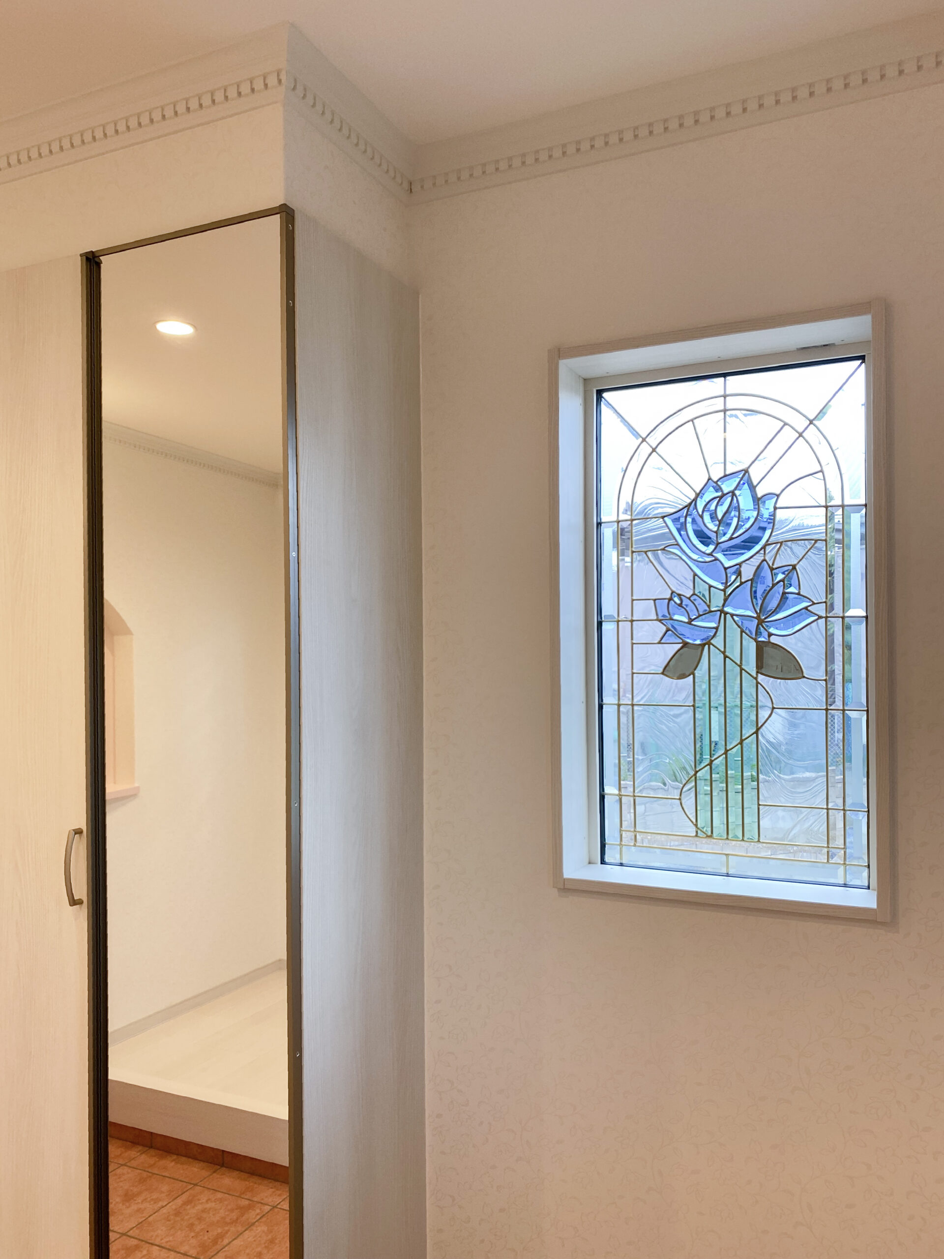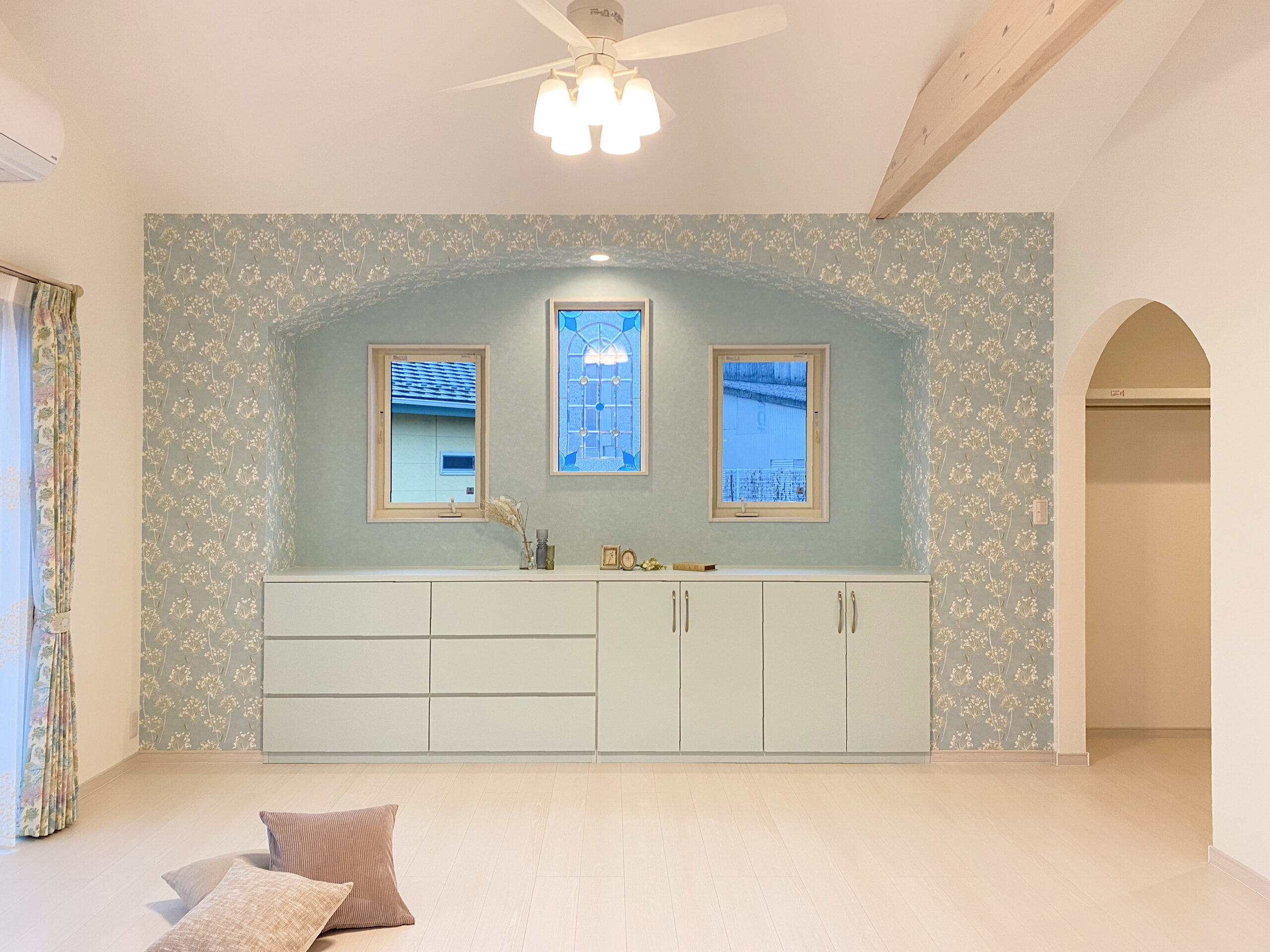 寝室にも、リビング同様に勾配天井を採用し、ほどよい広がりと落ち着きを両立した空間に仕上げました。玄関とは違うデザインのステンドグラスの窓を中心に、リビングのテレビ台と同様のアイスブルーのアクセントクロスを取り入れて造作収納の周りをコーディネート。色彩の統一感と可愛らしさが際立つ、心安らぐ寝室です。