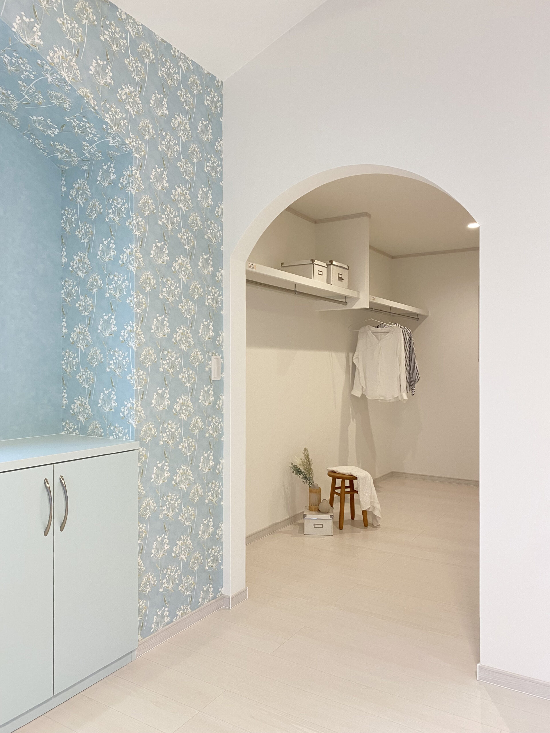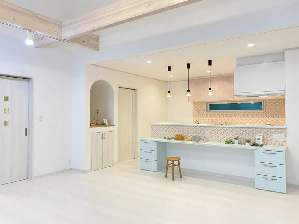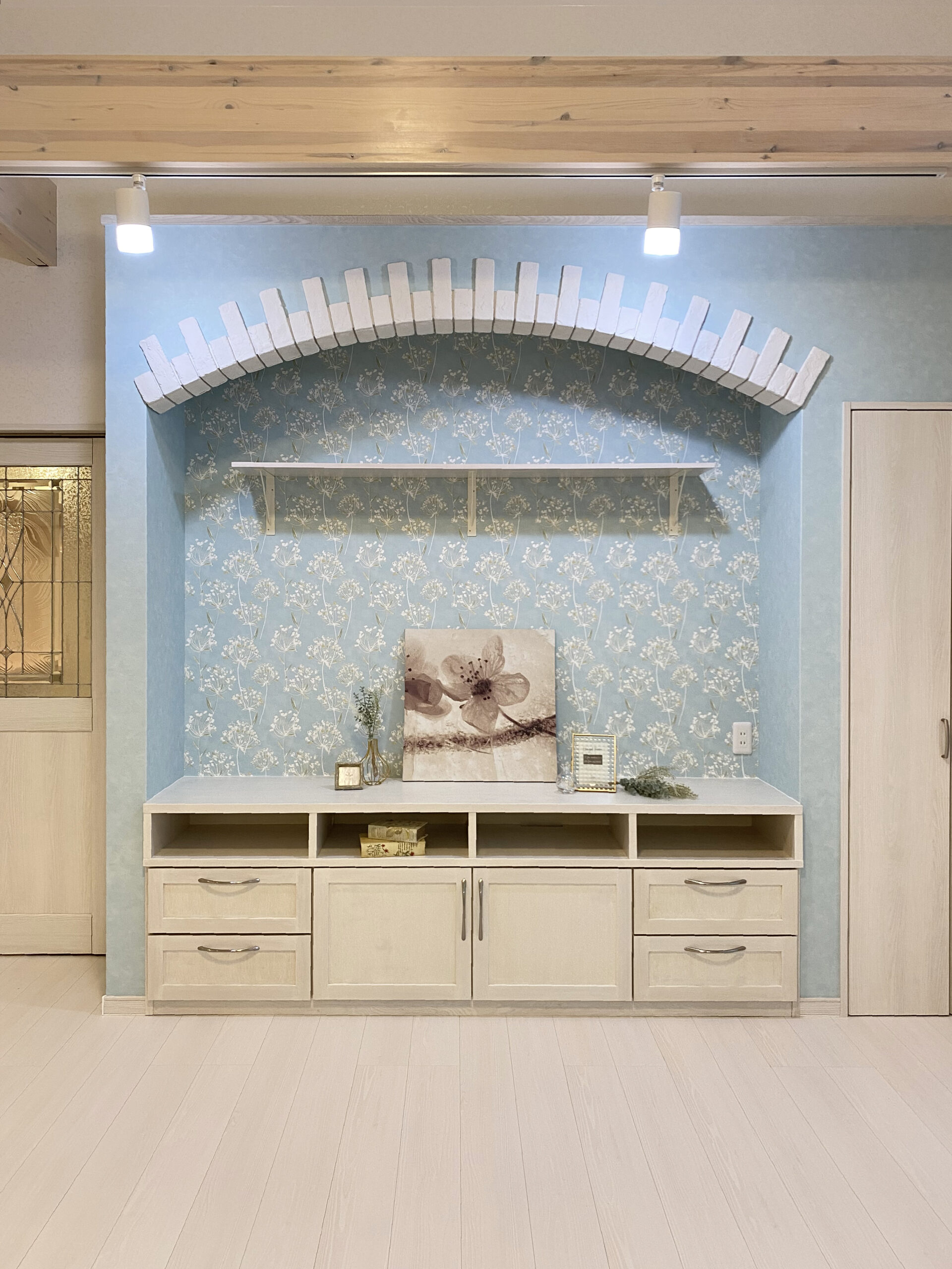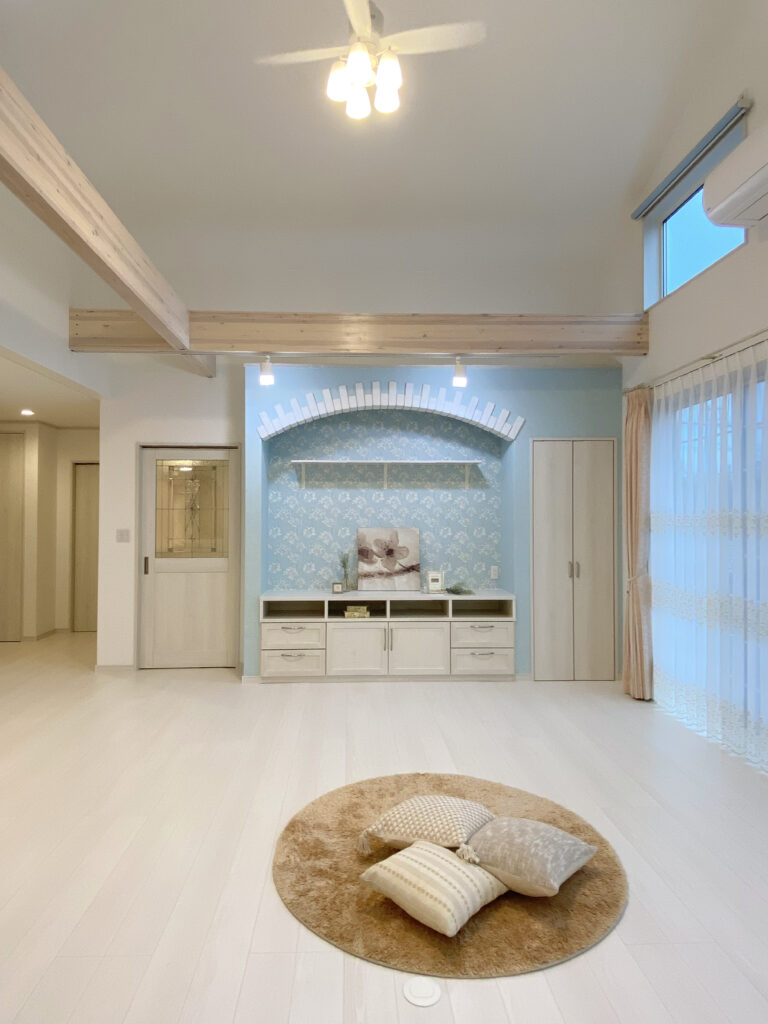家族が集うリビングは、開放感あふれる勾配天井と大きな開口により、光と風が通り抜ける心地よい場所に。テレビ周りにはアイスブルーのアクセントクロスを使った造作テレビ台を設置し、空間をふんわりと可愛らしく演出しています。アーチ部分に貼ったタイルとホワイトに塗装した梁も空間のアクセントに!