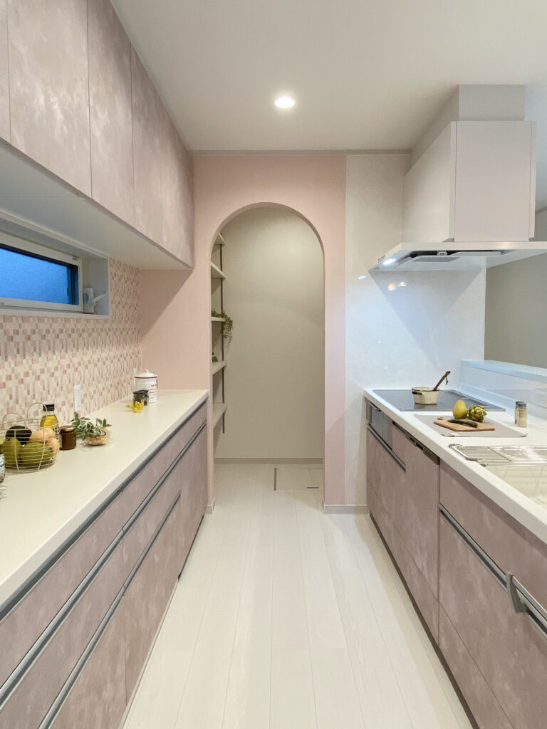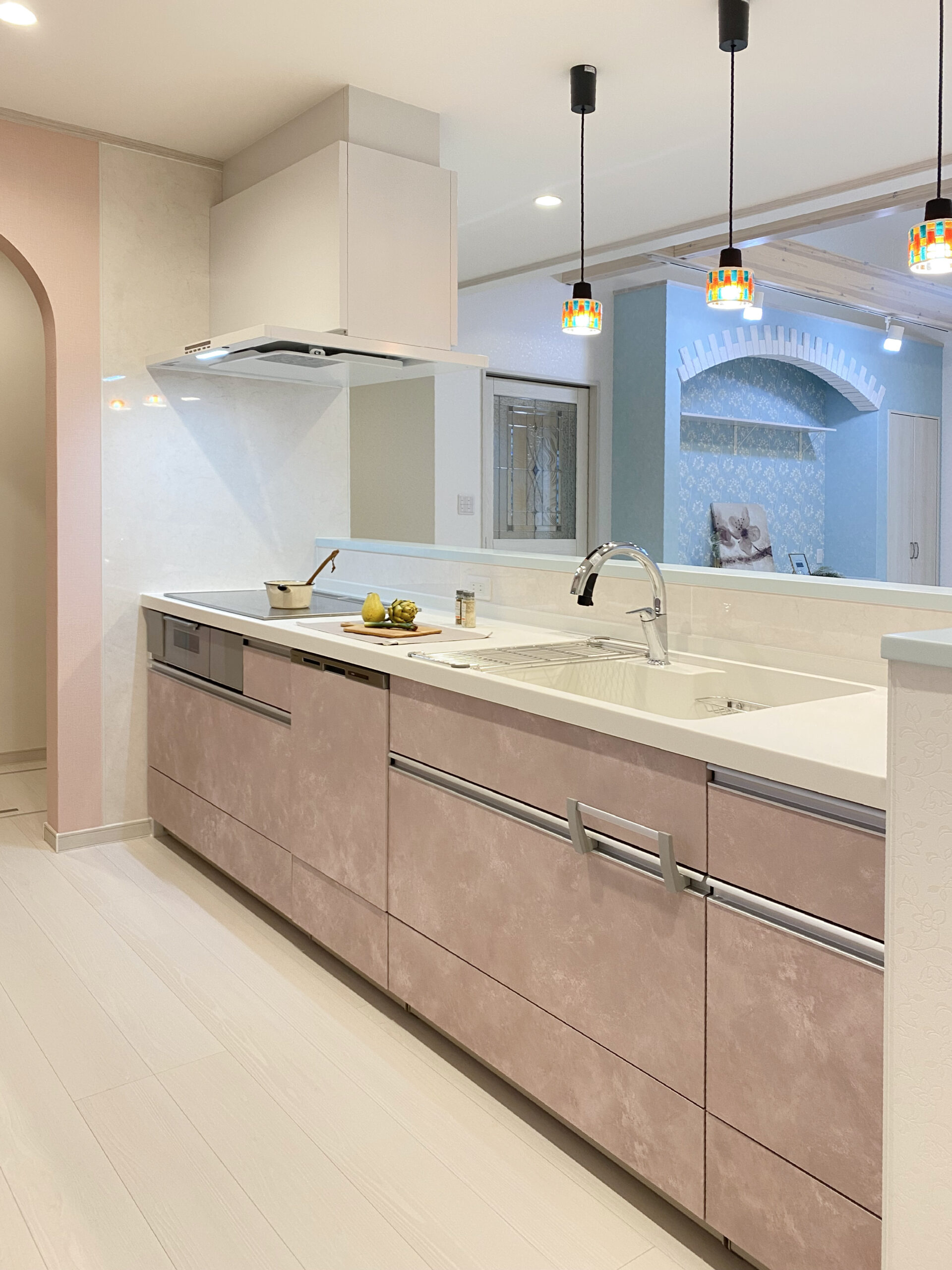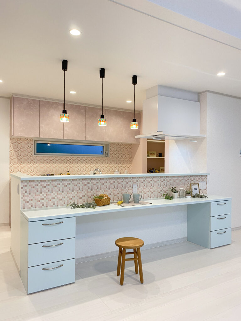キッチンはクリナップのステンレスキャビネットキッチン《ステディア》を採用。カラーは上品なトワルローズ。ステンレス構造ならではの清潔性と耐久性を持ちながら、デザイン性も兼ね備えています。キッチンカウンターには、淡いブルーが印象的な造作収納を設け、手元を照らすモザイクガラスのペンダントライトが華やぎをプラス。毎日の料理が楽しみになるキッチンです。