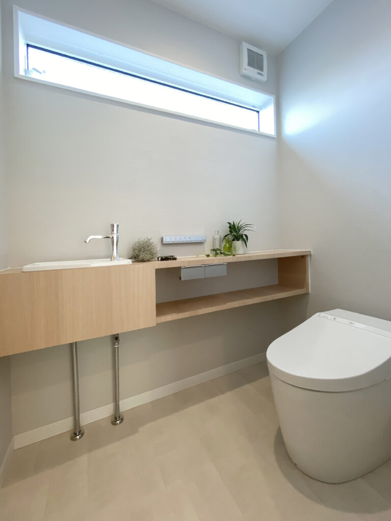 洗練されたシンプルモダンなデザインが魅力のトイレ空間。無駄を削ぎ落とした美しいラインで構成された造作カウンターは、明るい木目調が空間に温もりをプラスし、清潔感と開放感を演出しています。横長の高窓から自然光がたっぷりと差し込み、日中は照明いらずの明るさに。視線が抜ける設計で、限られた空間でも広がりを感じられます。手洗付きカウンターはシンプルでスタイリッシュな印象の埋込み型のカクダイ角型手洗い器と、オーク材をモチーフにした木目柄のメラミン化粧板を合わせました。メラミン化粧板はアイカ工業の「セルサス」シリーズに属する、指紋が目立ちにくい機能を持っています。カウンターの奥行きは260mmありますので、オープン棚にトイレットペーパーを収納するのにも充分な大きさです。カウンターの下の部分はお掃除し易いオープンスペースに。トイレ本体はTOTOのタンクレスタイプを採用しました。