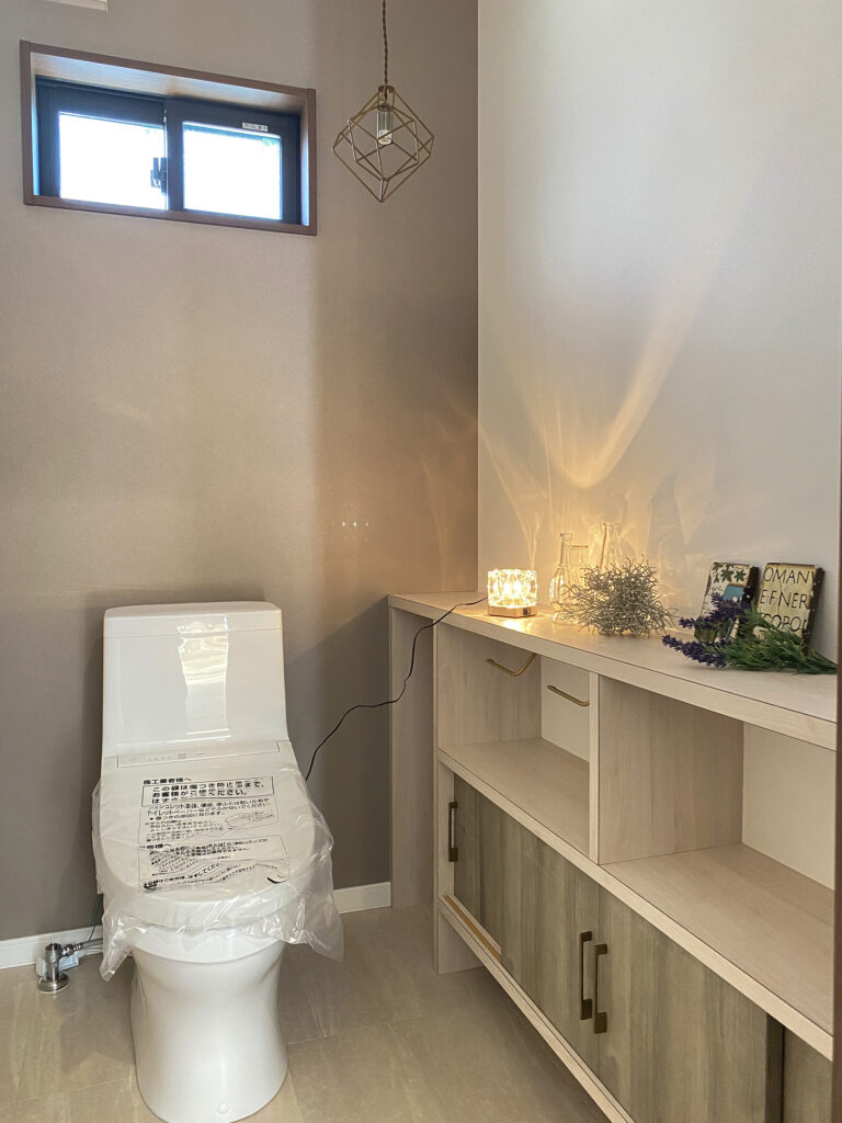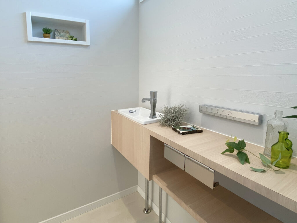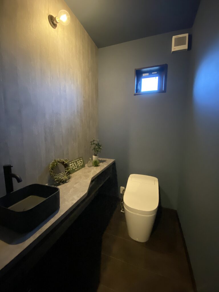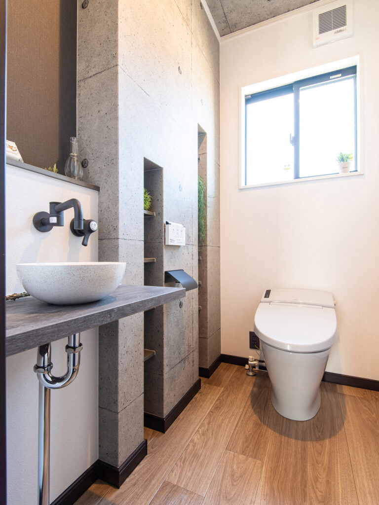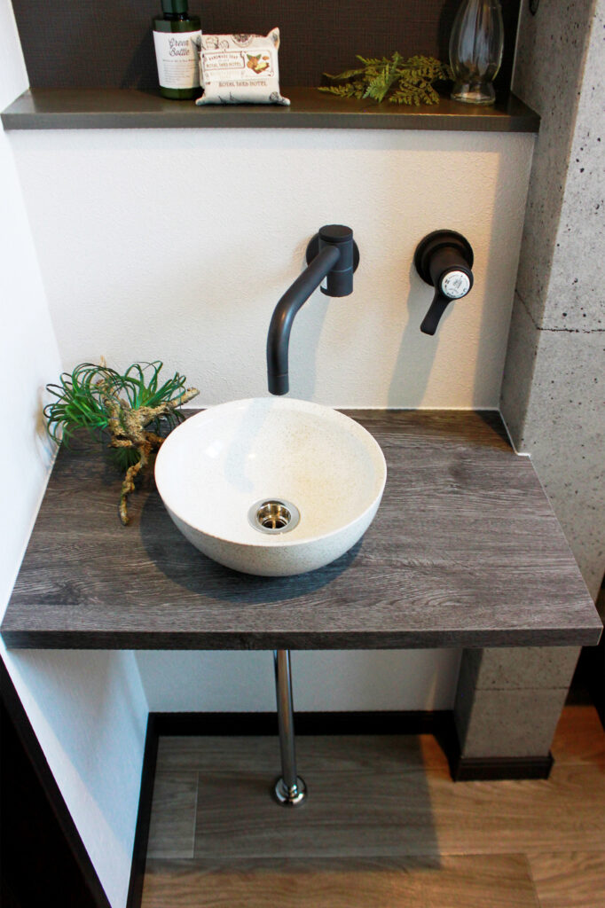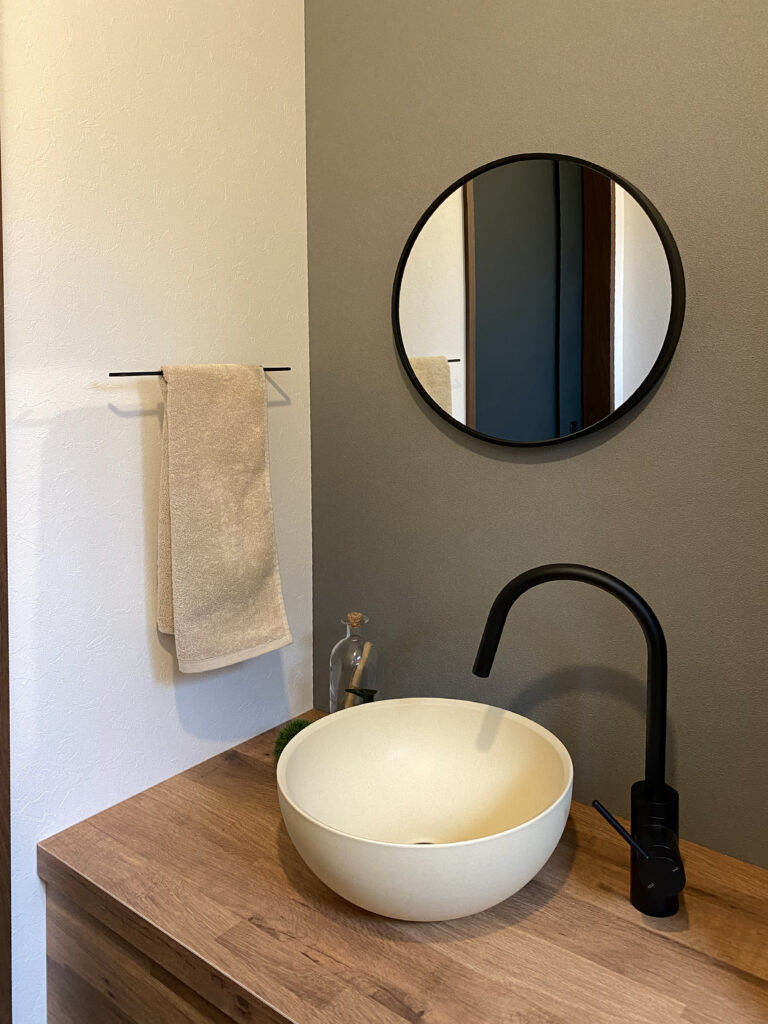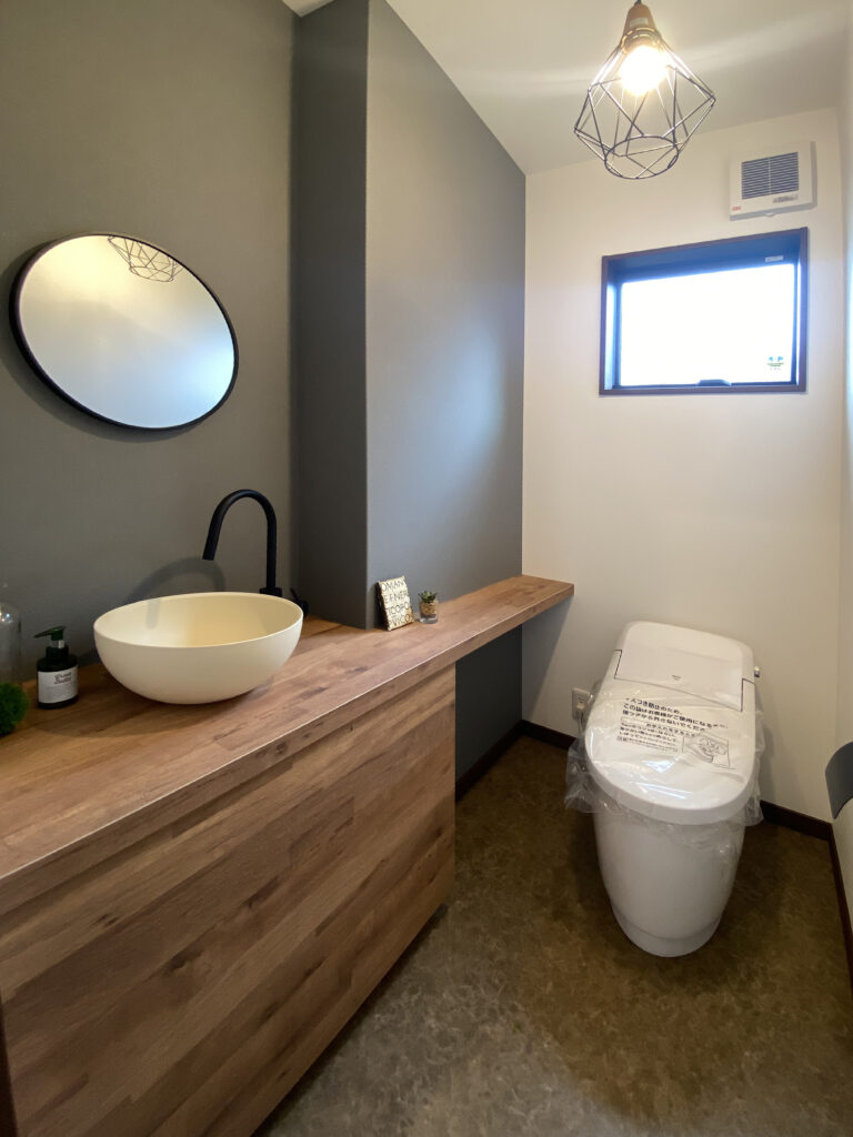 手前に550mm×350mmの手洗い用のカウンターを施工して、置型タイプのオンリーワン信楽焼手洗鉢を採用しました。壁からの横水栓のため配管用のふかし壁にしたことにより、鏡の手前に小物を置けるスペースができました。奥にはさらに厚みのあるふかし壁としてトイレットペーパー用のニッチを造作。コンクリート調のクロスが無機質で洗練させた雰囲気を出しながらも、木目とも相性が良く落ち着いた空間に仕上がっています。伊勢崎モデルハウスを参考にF様のお好みのカラーでF様仕様の世界観に再編!
