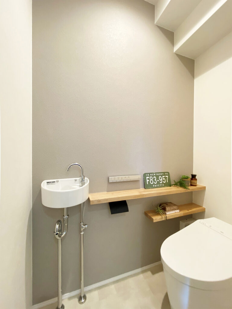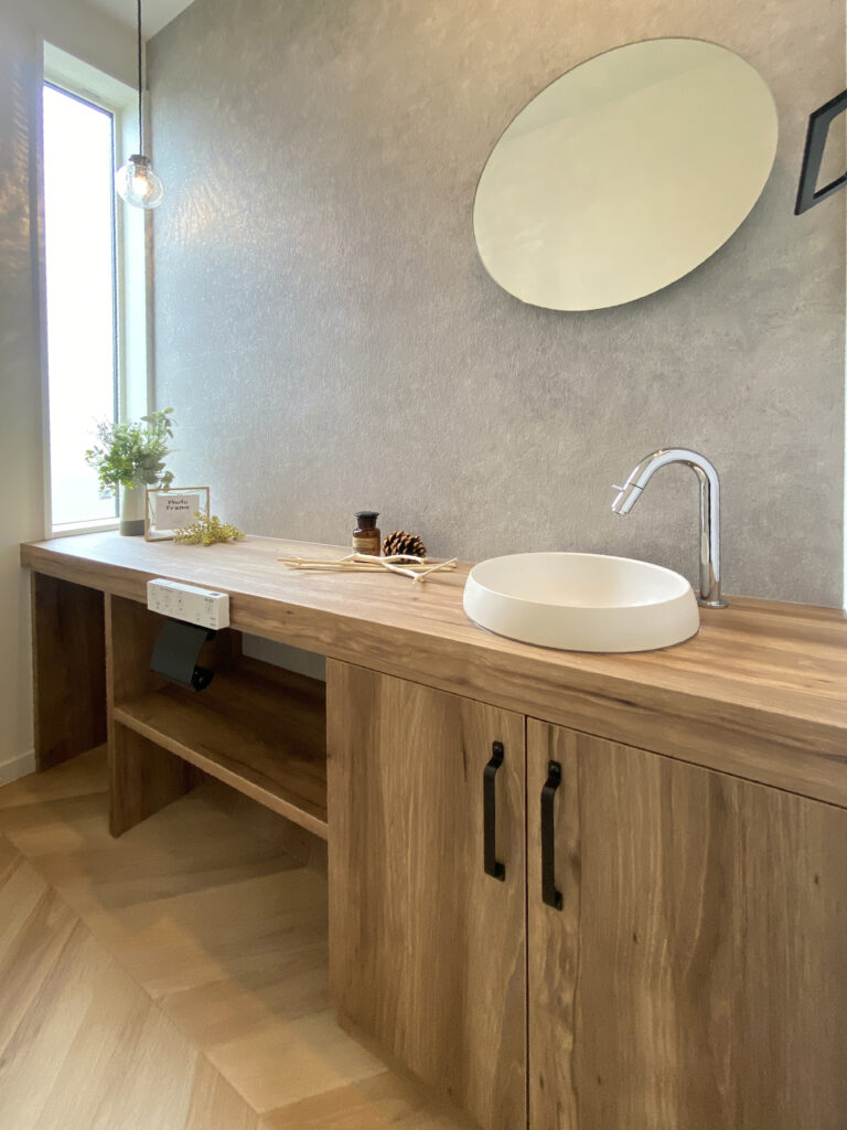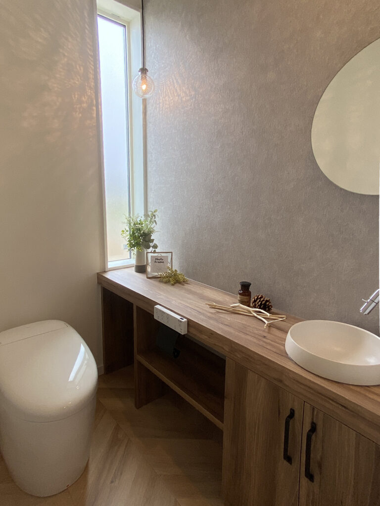 トイレカウンターの奥行きを手洗いがあるところは広く、トイレ本体があるところは狭くしてトイレ空間の幅を変えて施工しました。画像からは見えない反対側のスペースも奥行きの違う収納としてその違いが反映されています。円形の直径300mmのオンリーワンの信楽焼手洗いは、表面にツヤを抑えたベージュマット仕上げ。木の温もりを感じるカウンターとの相性も◎。グレーのアクセントクロスが引き締め役となり、ナチュラルでありながらスタイリッシュな印象を演出しています。水栓と照明もポイントとなり上質な空間に一役買っています。