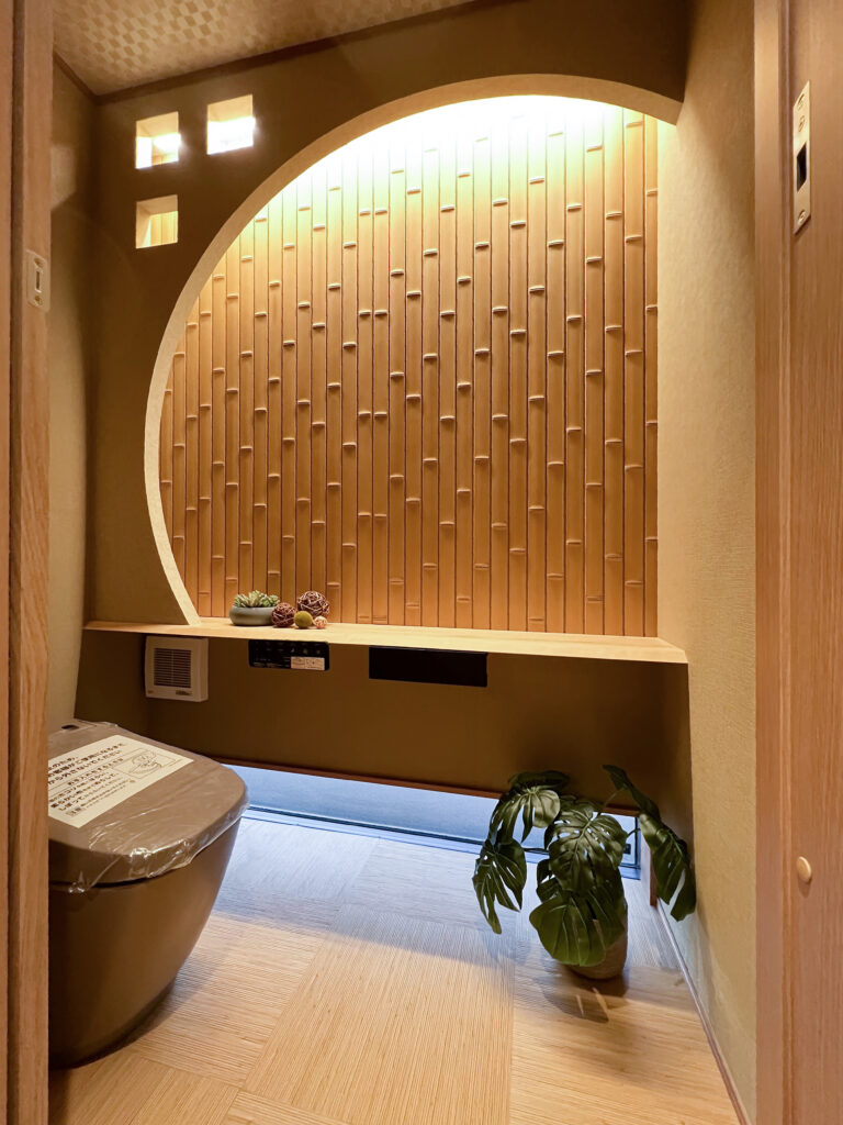 丸い意匠性のある壁と柔らかな間接照明が調和した、和モダンな雰囲気の空間です。壁面の立体的なデザインが上質なアクセントとなり、奥行きを感じさせます。京都の天然銘竹のリアルな質感と立体感を再現した人工竹グローベンリアルフィットを奥面に設置。竹本来の持つ奥深い風合いを表現しています。左側壁で隠れる部分には、さりげなくトイレットペーパーを重ねて収納できるようになっています。トイレ本体はリクシルのサティスGタイプ カラー:ノーブルトープを採用。灰色がかったブラウン(グレイッシュなブラウン)で、空間とも調和しています。日常の中に居ながらも高級旅館のような特別感を生み出すデザインで、お客様をお迎えする空間としても最適です。