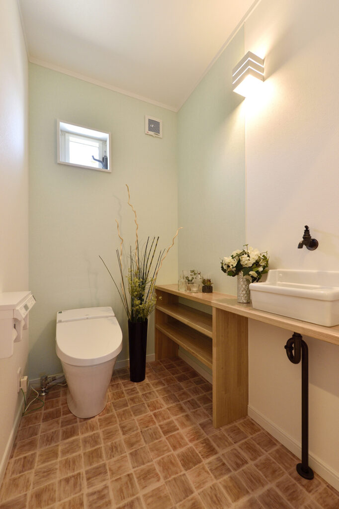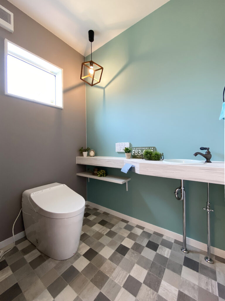 爽やかなブルーグリーンのクロスが印象的なO様邸のトイレ。背面に貼ったグレージュカラーのクロスと、濃淡差のある石目柄のクッションフロアが空間の世界観を作り上げています。ホワイト系の木目柄のメラミン化粧板で仕上げたカウンターに、エッセンスの亜麻色カラーの手洗器を埋め込みました。トイレ本体の近くにはトイレットペーパーを置くための固定棚を一段取り付けて実用性もアップ。木のフレームの照明がアクセントとなって、カジュアルでここちよい雰囲気を一層盛り上げます。