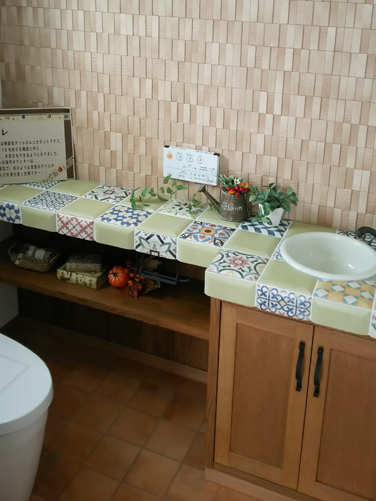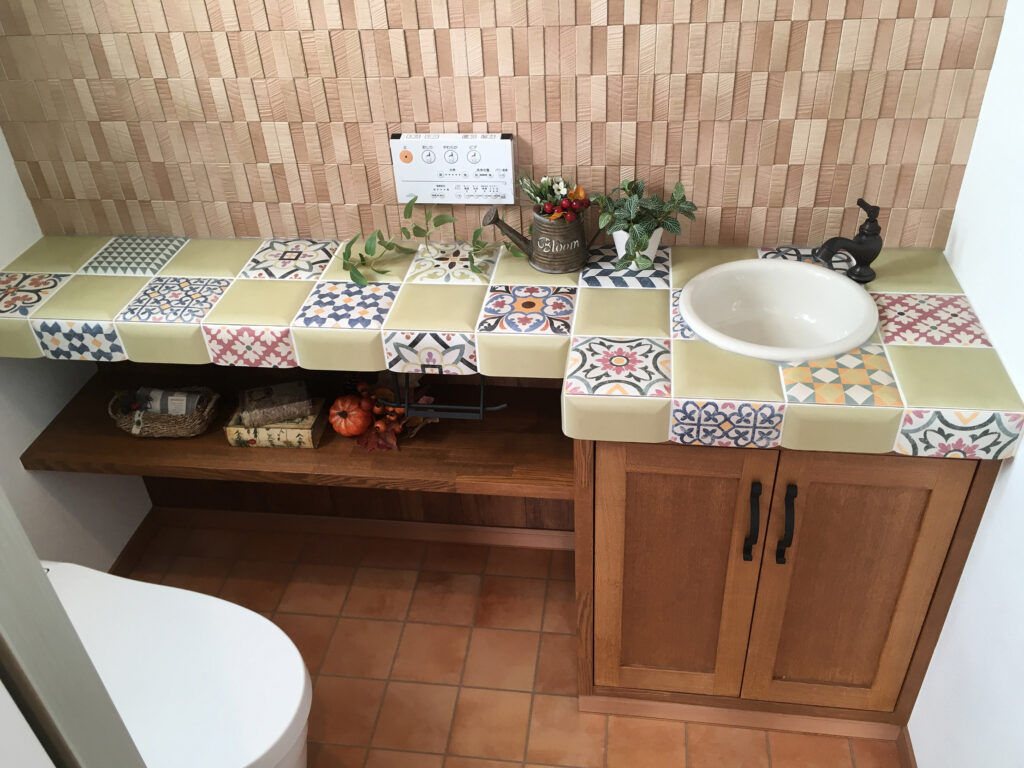大判のタイルとエコカラットが特徴的なK様邸のトイレ。タイルはマリスト ボンバート デコ エンツォ。個性豊かな全12種類すべてを使用して、その他の部分はグリーンのタイルを採用。亜麻色のラウンドタイプの手洗器を埋め込みました。ブロンズカラーの水栓がアンティークレトロな雰囲気を演出します。エコカラットはラフソーンのライトブラウン。木材を粗く切ったような仕上げのレリーフが特徴です。エコカラットは吸放出性に優れ、湿気やニオイを軽減して快適な空間を保つためトイレとの相性も◎。カウンターの下は一部扉付きの収納棚で、小物をすっきりと収められる実用性も魅力です。