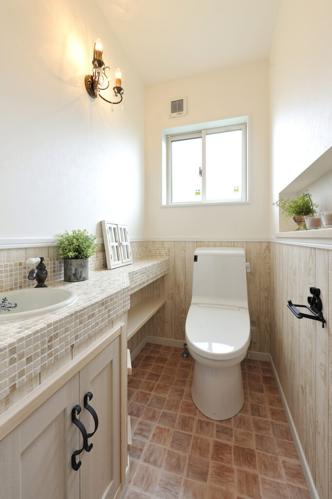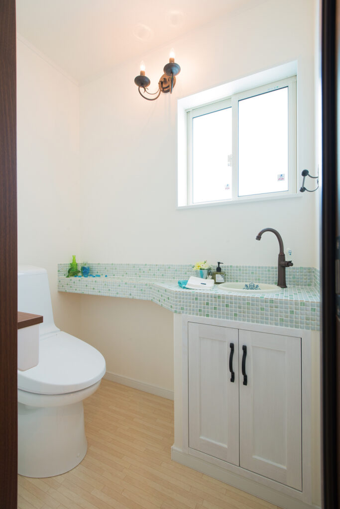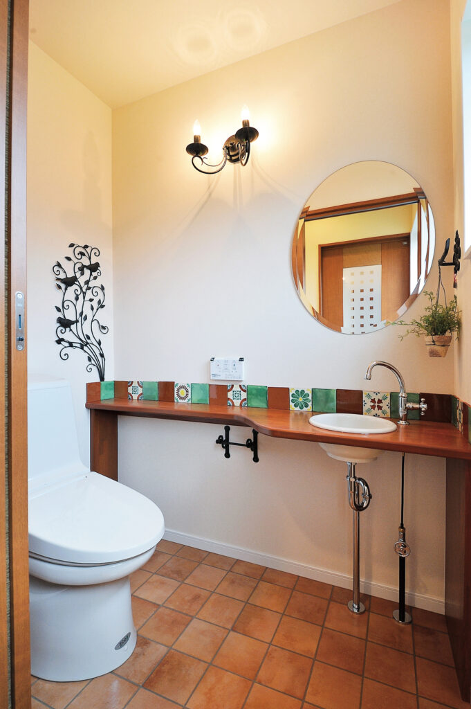 ミディアム色のカウンターにエッセンスの亜麻色ラウンドタイプの手洗器を埋め込みました。水栓は空間に自然と馴染むシンプルなクローム色。特に注目したいのはカウンター立上り部分に一列に貼ったタイル。約100mmのタイルが光を柔らかく反射し、空間に上品な輝きをもたらします。アンティーク調のブラケット照明をはじめ黒のアイアン製品がポイントとなりA様のお好みの世界観が垣間見られるようですね。皆様に紹介したい素敵なトイレ空間のひとつです。