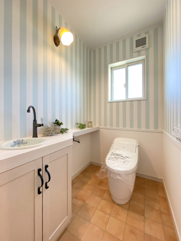 カウンターから上の部分全体にグリーンのストライプを施したK様邸のトイレ。カジュアルで清潔感のある印象を与えてくれます。小物をすっきり収納できる扉付きのカウンターは明るい木目柄を採用。エッセンスのコレクティブルズ手洗器を埋め込みました。ブロンズ色のコンスタンティン水栓とフラワーモチーフのブラケット照明も存在感を放ち、かわいいと元気を併せ持ついつまでもここに居たいと思える空間です。