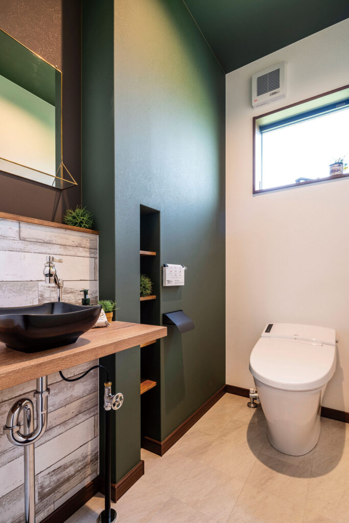 手前に550mm×350mmの手洗い用のカウンターを施工して、置型タイプのエッセンススクエアタイプのグラファイトを採用しました。ふかし壁にして鏡のところに小物を置けるスペースもつくりました。奥にはさらに厚みのあるふかし壁としてトイレットペーパー用のニッチを造作。深みのあるグリーンとブラウン、そして木目の壁紙が森にいるかのような印象を与えてくれます。伊勢崎モデルハウスを参考にK様がお好みの手洗器、水栓をチョイスして造り上げたK様オリジナルのトイレになりました。
