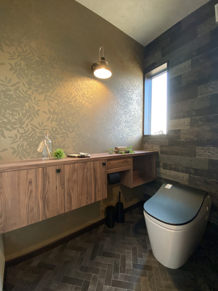 大泉モデルハウスを参考にしてK様オリジナルのトイレカウンターが完成しました。上部はオープンスペース、下部は扉付きの造作棚にしましたので、使用頻度に合わせて小物類をスッキリ収納することが可能です。ウォールナット柄とブラックチェリー柄、そして背面のブラウンのアクセントクロスがナチュラルでありながらモダンな印象をあたえてくれます。ブラックのアイアン取手とペンダントライトが空間のアクセントになっています。
