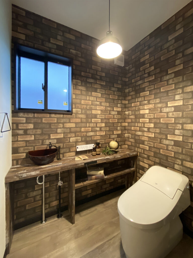 エイジドプリント柄のカウンターと、ヴィンテージ調のレンガ柄の壁が印象的な、カフェのような雰囲気のトイレ空間。エッセンスSクレセントE381050ブラウニーカラーの半月型の手洗器をチョイス。奥行き250mmのカウンターに造作しています。焼き物の良さや味わいを生かした美しい手洗器で、ブロンズ仕上げの水栓とも調和してアンティーク感漂う仕上がりになっています。画像では見えにくいのですが照明は緑色の金属製のシェードで、工場や秘密基地ののような雰囲気を演出し、全体的にファクトリー風のデザインのトイレになりました。