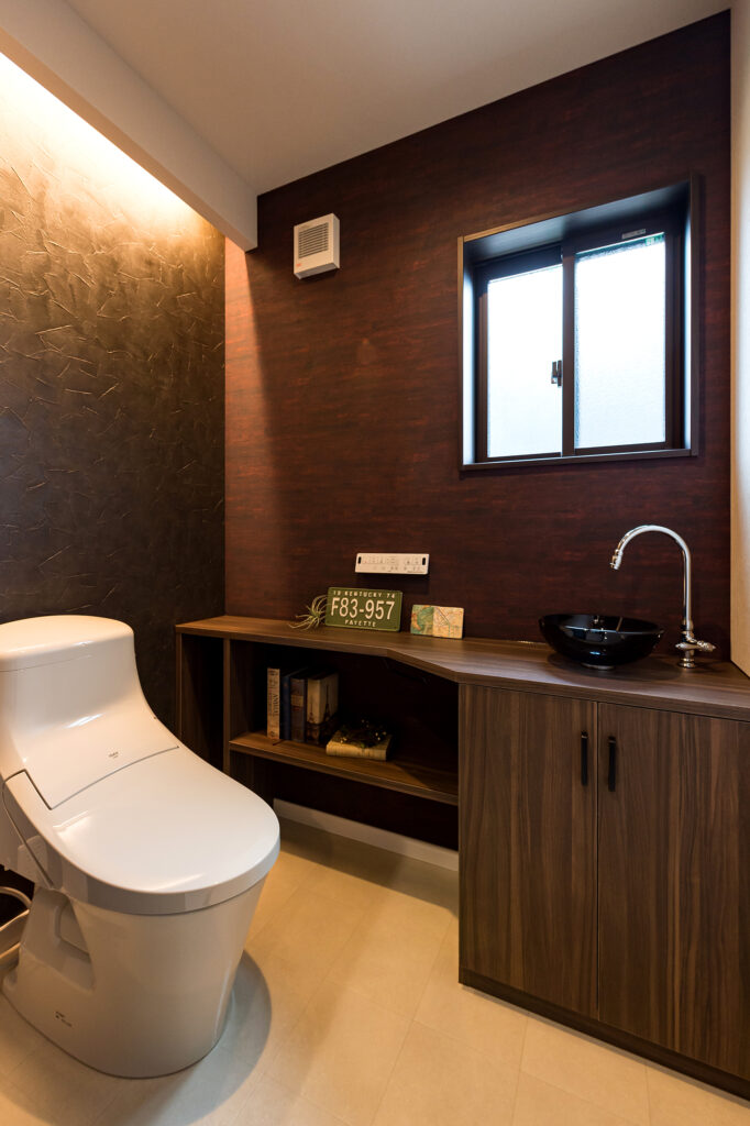 金属をエイジング加工したような深みのある赤茶のクロスと、黒の石目調クロスが織りなすコントラストが美しいK様邸のトイレ空間。木目の水栓付きカウンターを造作しました。手洗器はインクコーポレーションのガラスボウル置型。シルバーの水栓を合わせればカジュアルな雰囲気も引き出してくれますね。カウンターは手前部分が扉付きで、排水トラップも隠す役割も担い、見た目もスッキリと実用性も◎。間接照明を取り入れたことで落ち着きと高級感がプラスされ洗練された雰囲気に仕上がりました。
