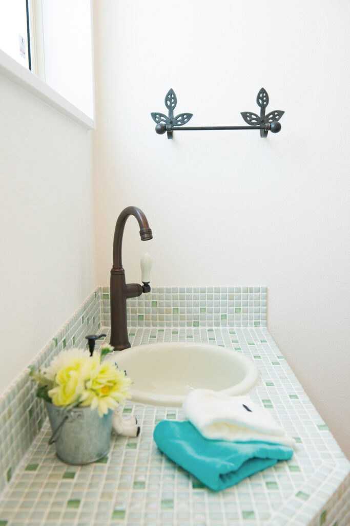 ナチュラルで温もりを感じるデザインが魅力のトイレ空間。白木にペンキを塗ったかのような壁紙と柔らかな色合いの床材が、落ち着きと清潔感を演出しています。特に注目したいのは、カウンターや洗面台に使用されたモザイクタイル。15mmのアンティーク仕上げの小さめタイルが光を柔らかく反射し、空間に上品な輝きをもたらします。タイルは見た目の美しさだけでなく、耐水性・耐久性にも優れており、日々のお手入れが簡単なのも大きな魅力。エッセンスコレクティブルズの手洗器と水栓レバーもセットで使用し、ノスタルジックでレトロな雰囲気を盛り立てます。