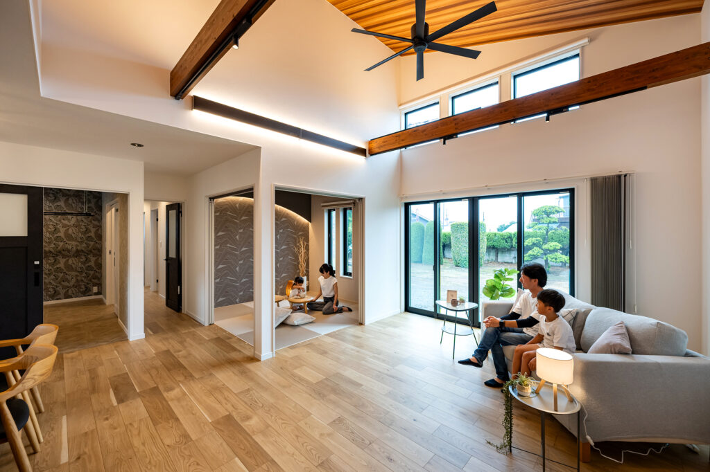 タイルデッキとの行き来のしやすさに加え、 いつでも庭の植栽を眺められるようにと設けられた、連続する掃き出し窓。陽の光を取り込むための高窓も含めた窓のレイアウトこそ入念な打合せの賜物だ。LDKに隣接する和室はキッズスペースや客間として活用予定で、壁に描いたアーチも同社の柔軟性と自由度の高さを物語る。