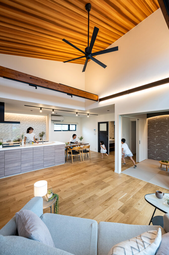 床材はオークの突板、 さらに勾配天井に用いたレッドシダー柄の壁紙など木の雰囲気を活かしながら、随所に間接照明を織り交ぜることでお洒落にコーディネートした邸内。 特にリビングの開放感は抜群で、 ソファに腰掛けて天井や梁を眺めることも楽しみの一つとなる。