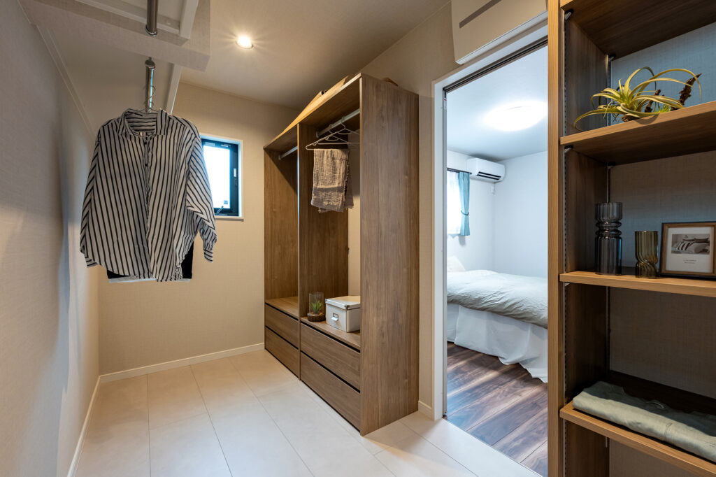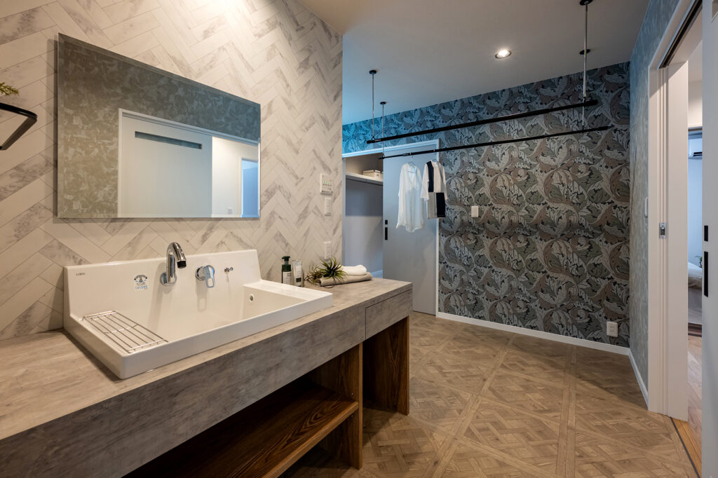 3か所から出入りできる脱衣室兼ランドリールーム。 ウォークスルーのファミリークローゼットを経て寝室とも繋がるなど、 見た目以上に 「生活しやすい動線」 に力を入れたことが自然と伝わる。
